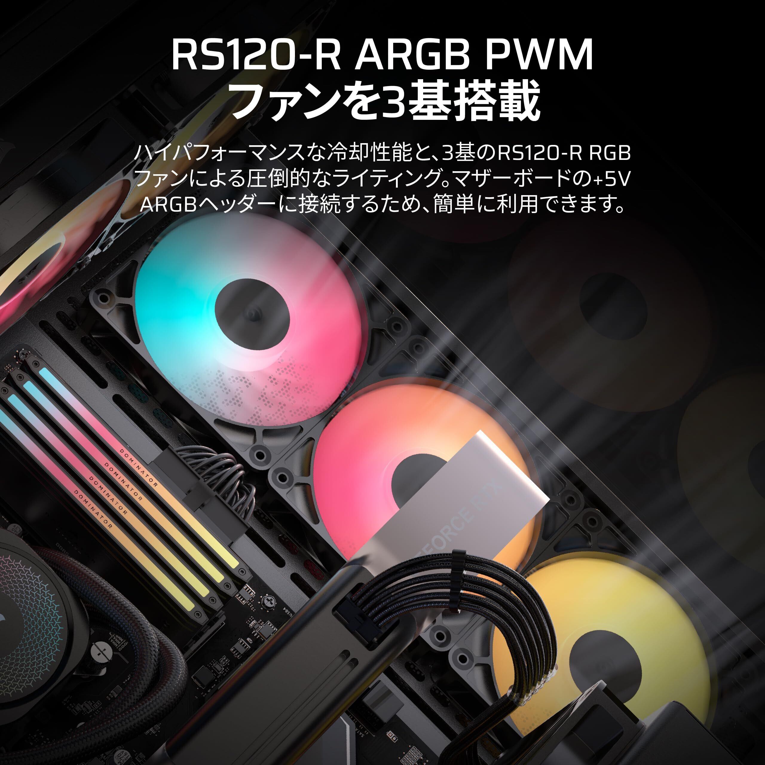 3基のRS120-R ARGBリバースファンで高い冷却効果と明るく美しいライティングを楽しめ、+5V ARGBヘッダー経由で簡単にコントロールできます。