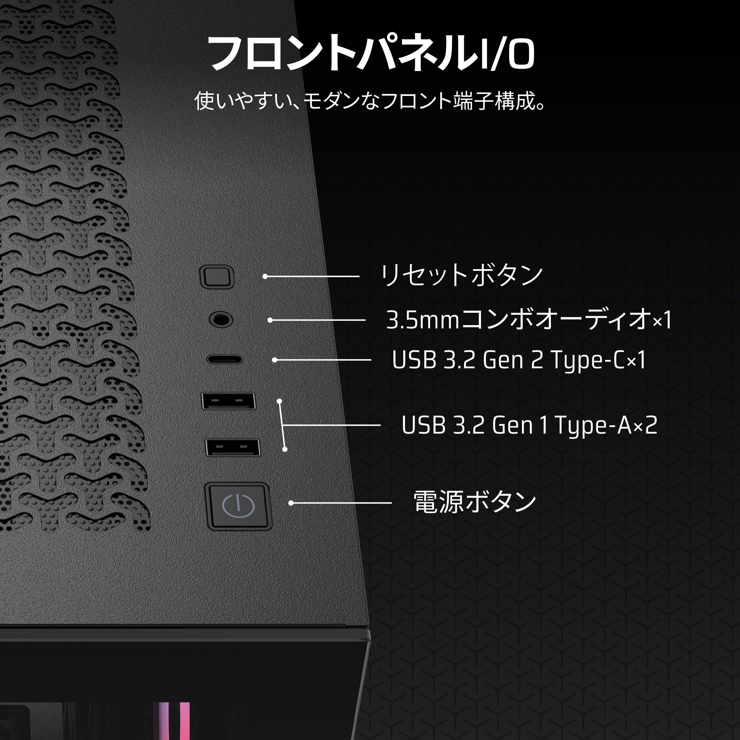 「前面とサイドには強化ガラスパネルを使用しており、内部の美しいパーツ群をしっかりと見せるデザインになっています。自作PCの魅力を引き立たせ、インテリアとしても楽しめる一台です!」