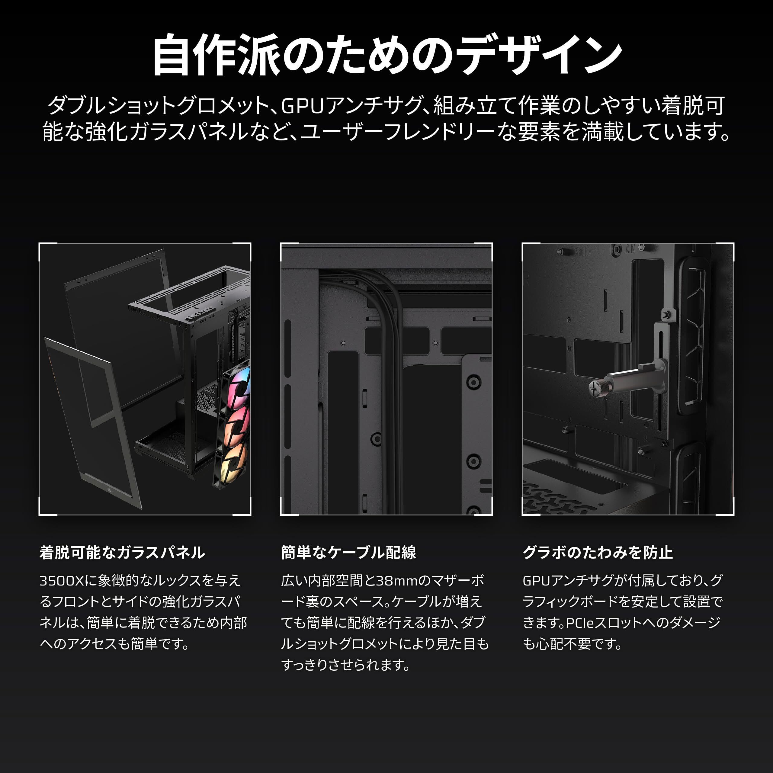 素晴らしいビルドと素晴らしい眺め :3500Xは優れた冷却効果と必須機能をすべて備え、Mini-ITXからEATXまでのマザーボードフォームファクターをサポート。ラップアラウンドガラスの美しい外観で、最高の視界を提供します。