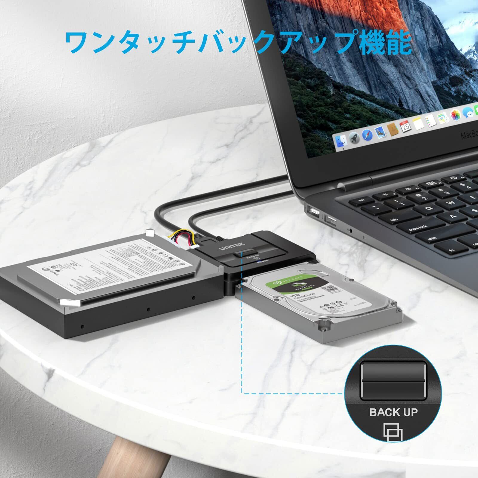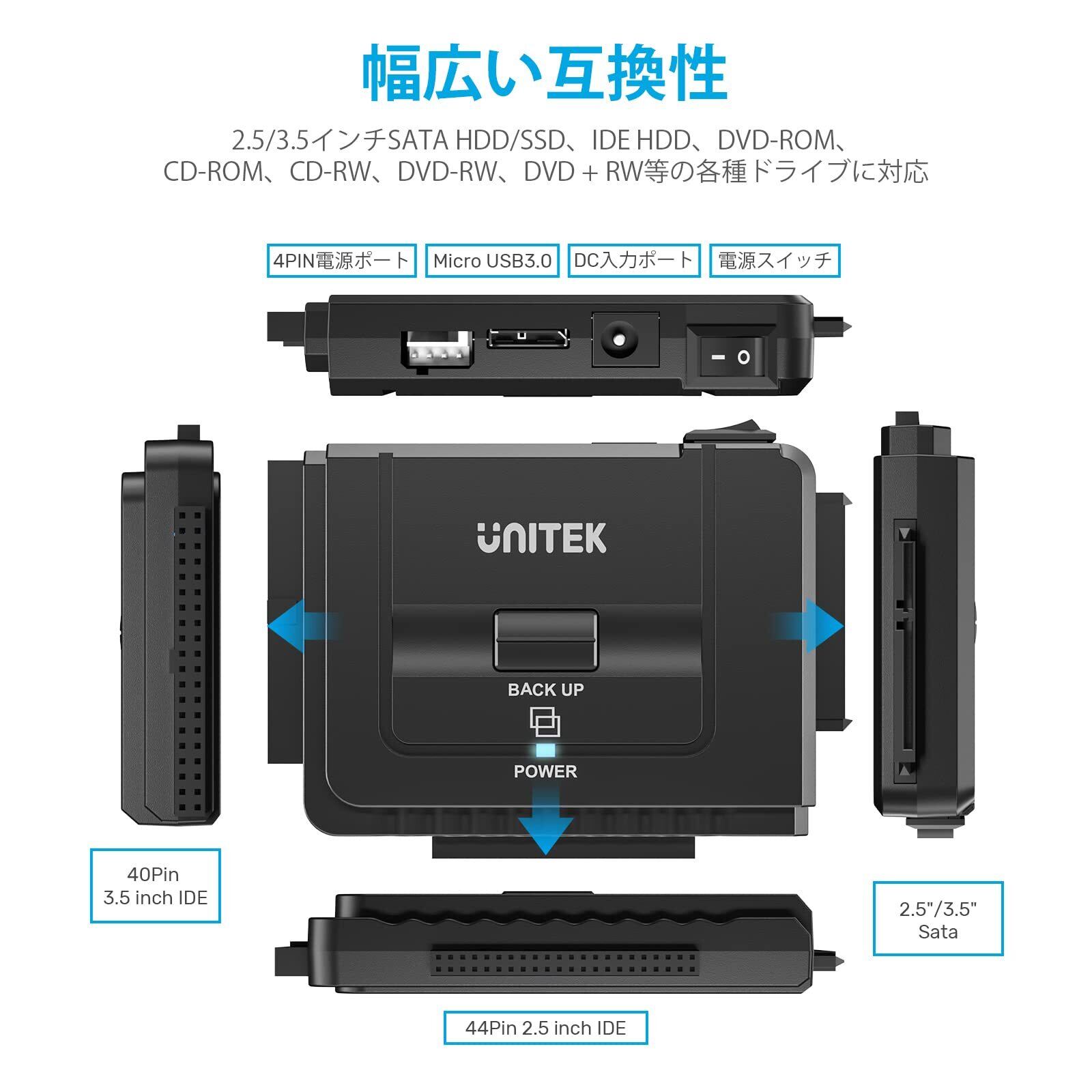 Unitek USB-A IDE SATA 両方対応 USB3.0 ドライブ交換アダプター 2.5/3.5インチHDD SSD 光学ドライブに対応 コンバータ 最大18TB 5Gbps 12V/2A電源アダプター付き 外付けドライブ 超高速データ転送 切り替えスイッチ ワンタッチバックアップ 丸ごとコピー 復元ソフトウェア 簡単操作