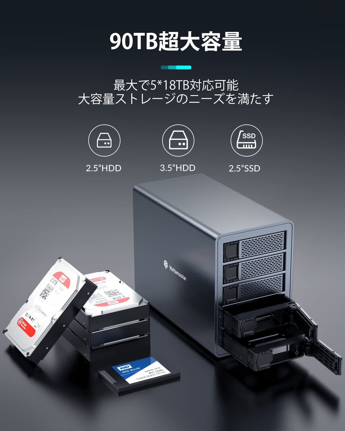「最大90TBの大容量ストレージが可能で、ストレージニーズに幅広く対応します。 5Bay構造により、データの整理やバックアップも効率的に行えるため、ビジネスに必須の高い機能性を誇ります。」