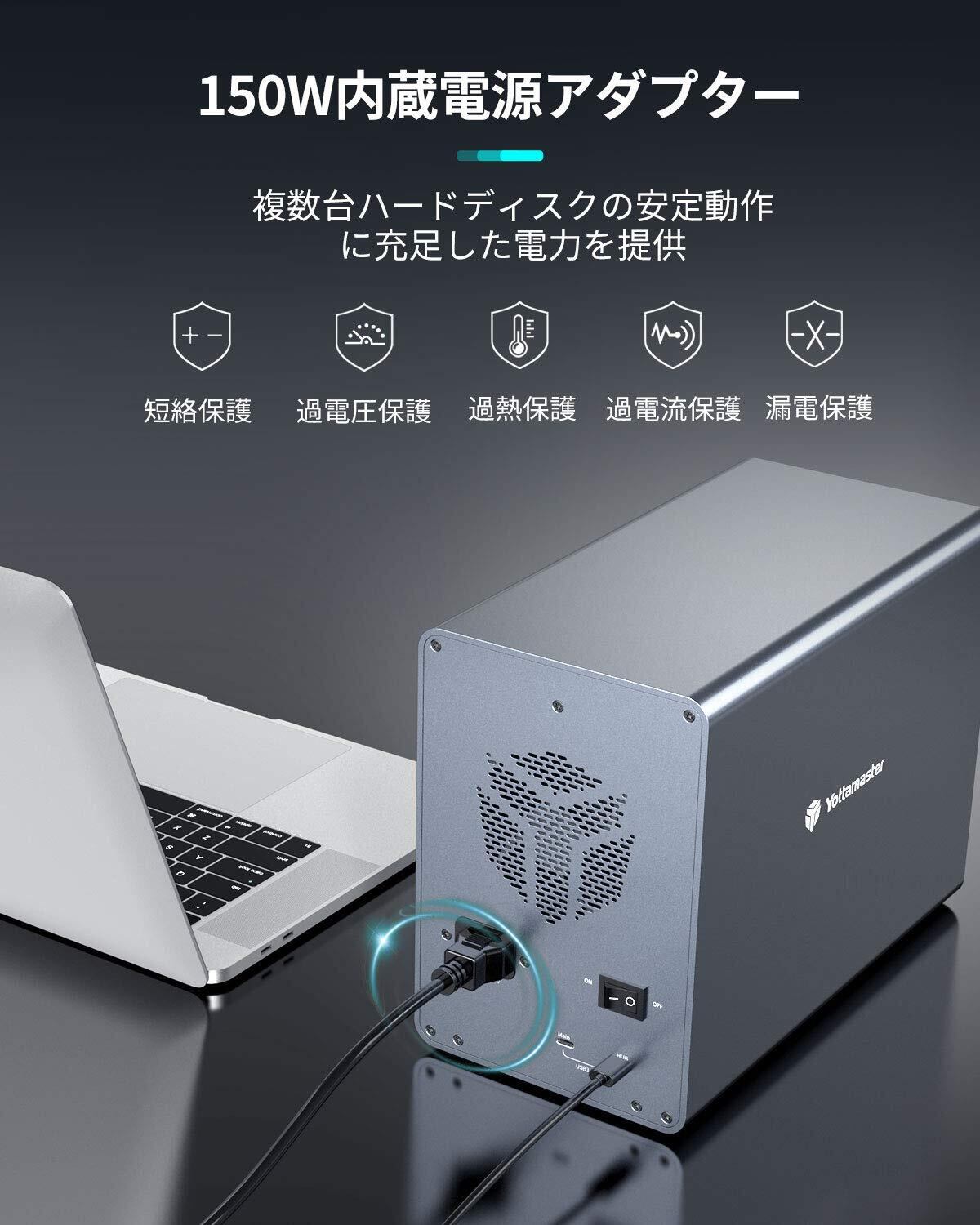 【澎湃な電力パワー】150Wハイパワー内蔵電源アダプターを搭載、複数のハードディスクの動作に充足なパワーを提供します。ドライバー不要で、電源コードとUSBケーブルを接続するだけで利用可能ですので、デスクがスッキリと配線できます。