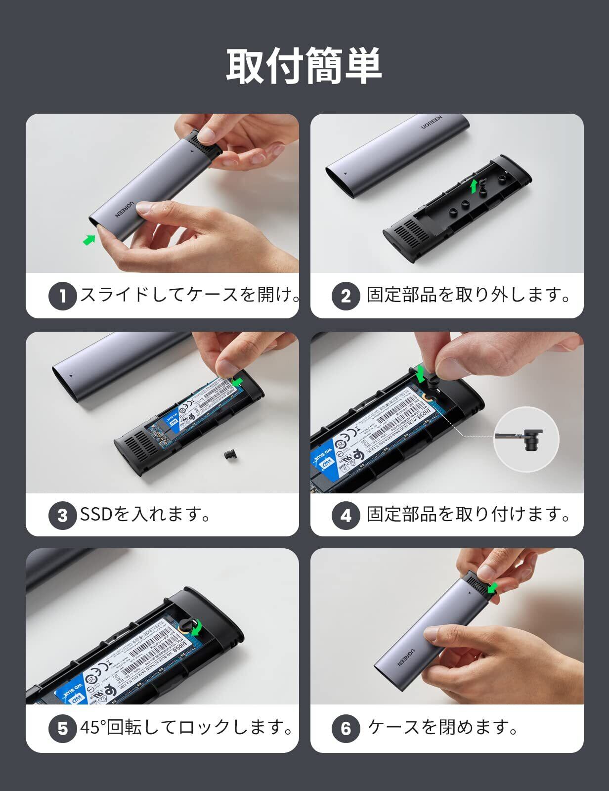 お客様サポート:ご不明点やご質問がございましたら、いつでもお気軽にお問い合わせください。「UGREEN M.2 SSD ケース」で、快適なデータ管理を実現しましょう!