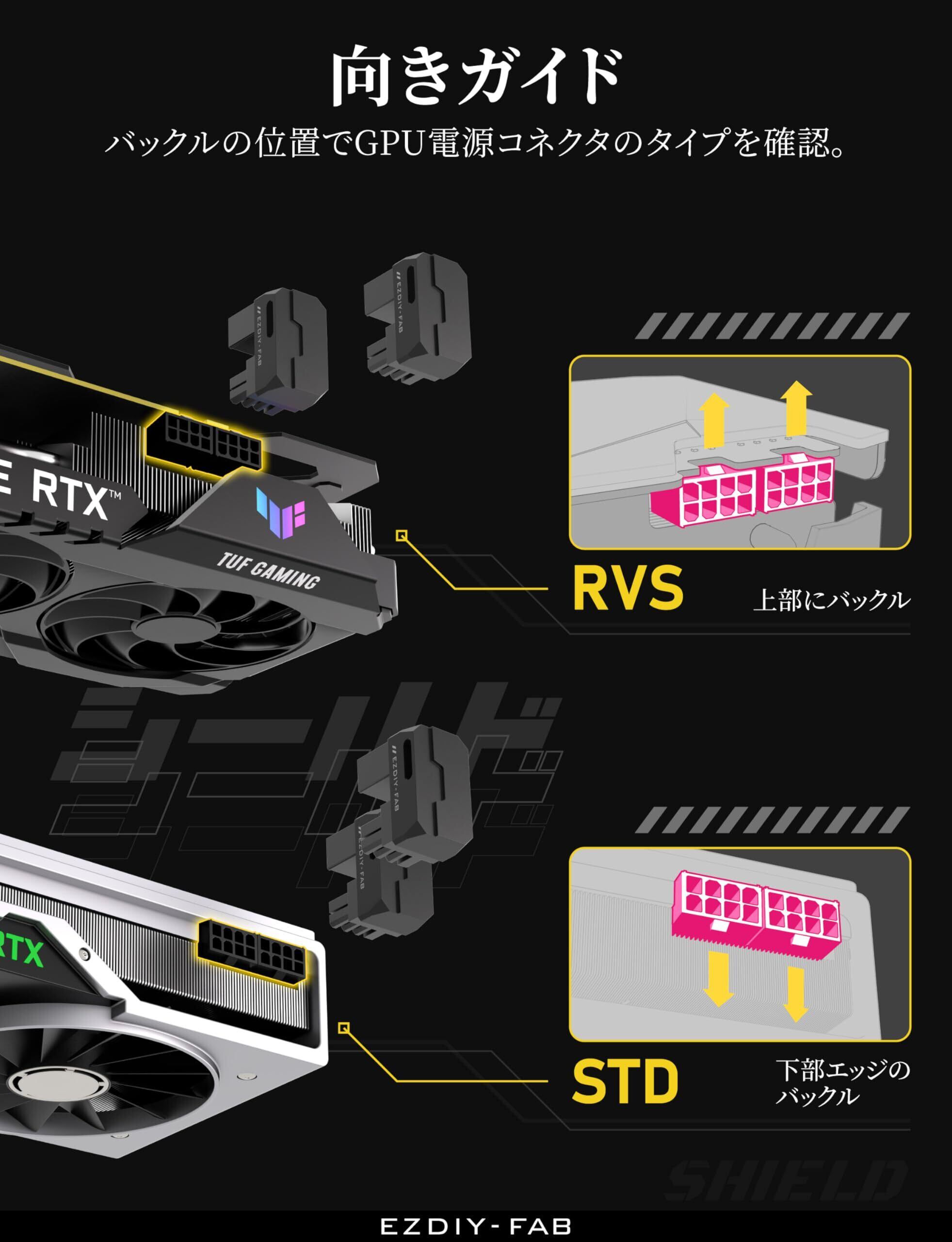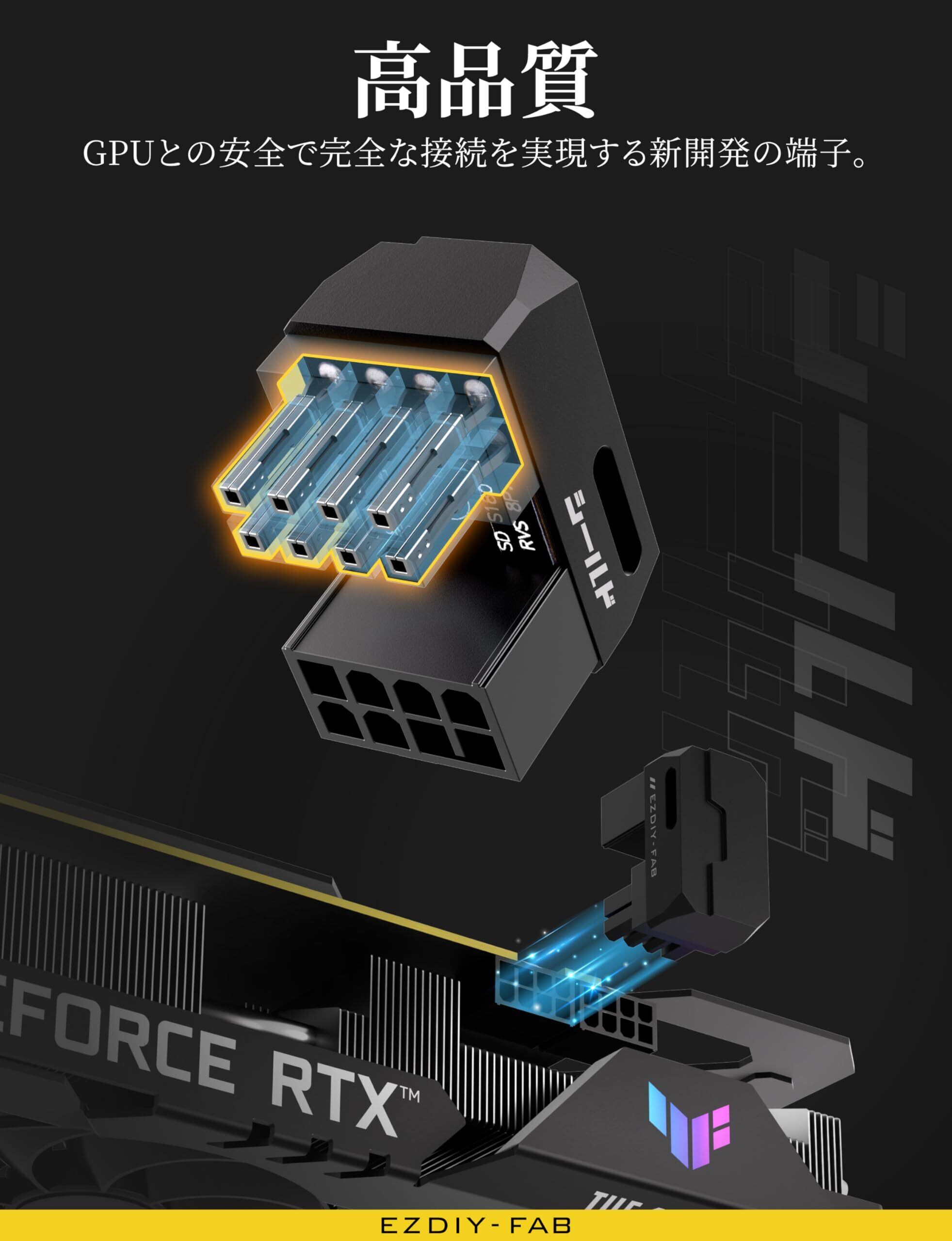 「『EZDIY-FAB シールドシリーズ』の8ピン電源アダプターは、180度の角度デザインにより、グラフィックボードの取り付けをさらにスムーズにします!最適なスペース活用が可能で、ケーブルを整理整頓することができます。」