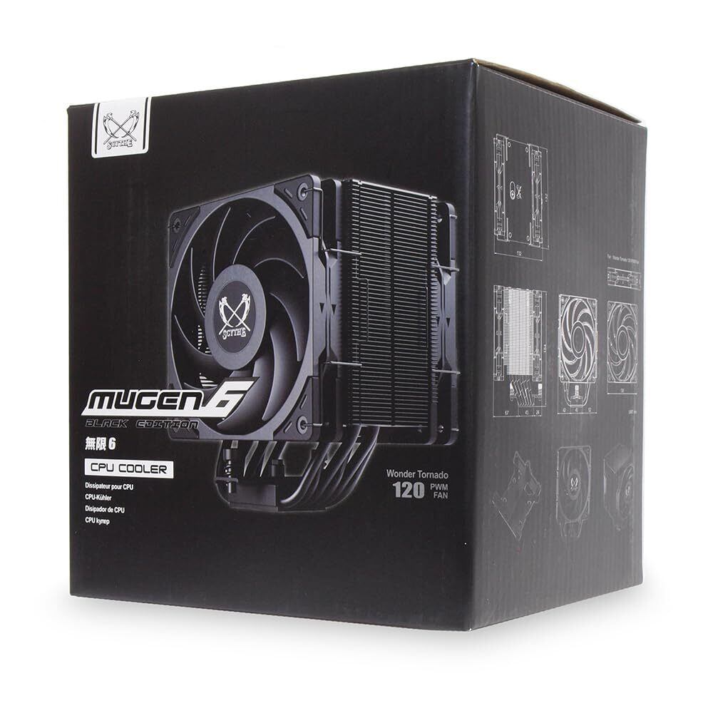 「『SCYTHE MUGEN6 BLACK EDITION』は、高性能サイドフロー型CPUクーラーで、デュアルファンを搭載することで、優れた冷却性能を実現します!特に6本の6mm径ヒートパイプが熱伝導を最大化し、CPUを常に快適な温度に保ちます。」