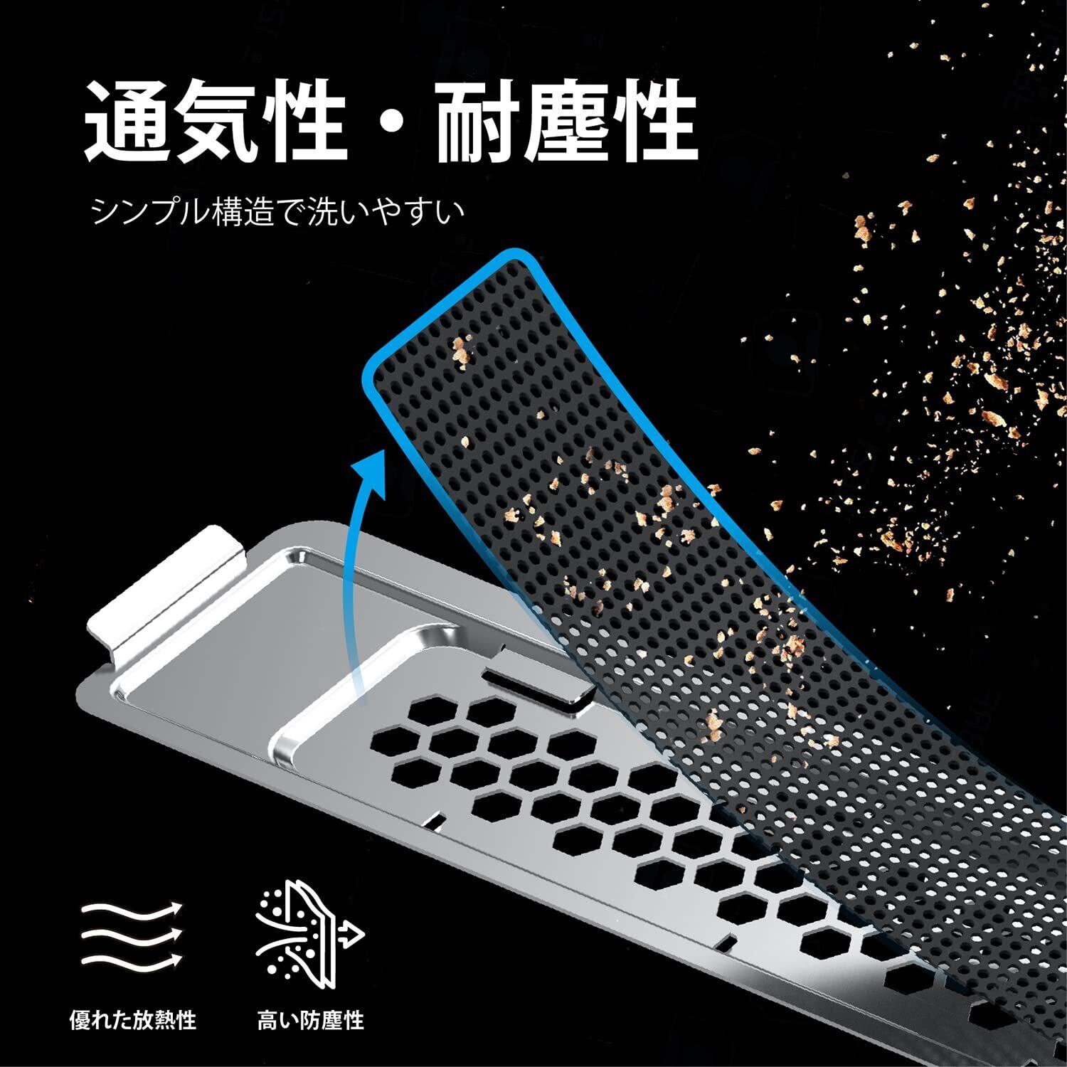「このカバーは、ヒートシンクと一体化したデザインを採用し、熱の拡散を効率的に行います。PS5の高性能を維持するために、熱管理が不可欠です!スタイリッシュな銀色仕上げは、ゲーム環境にぴったりの美しさを演出します。」