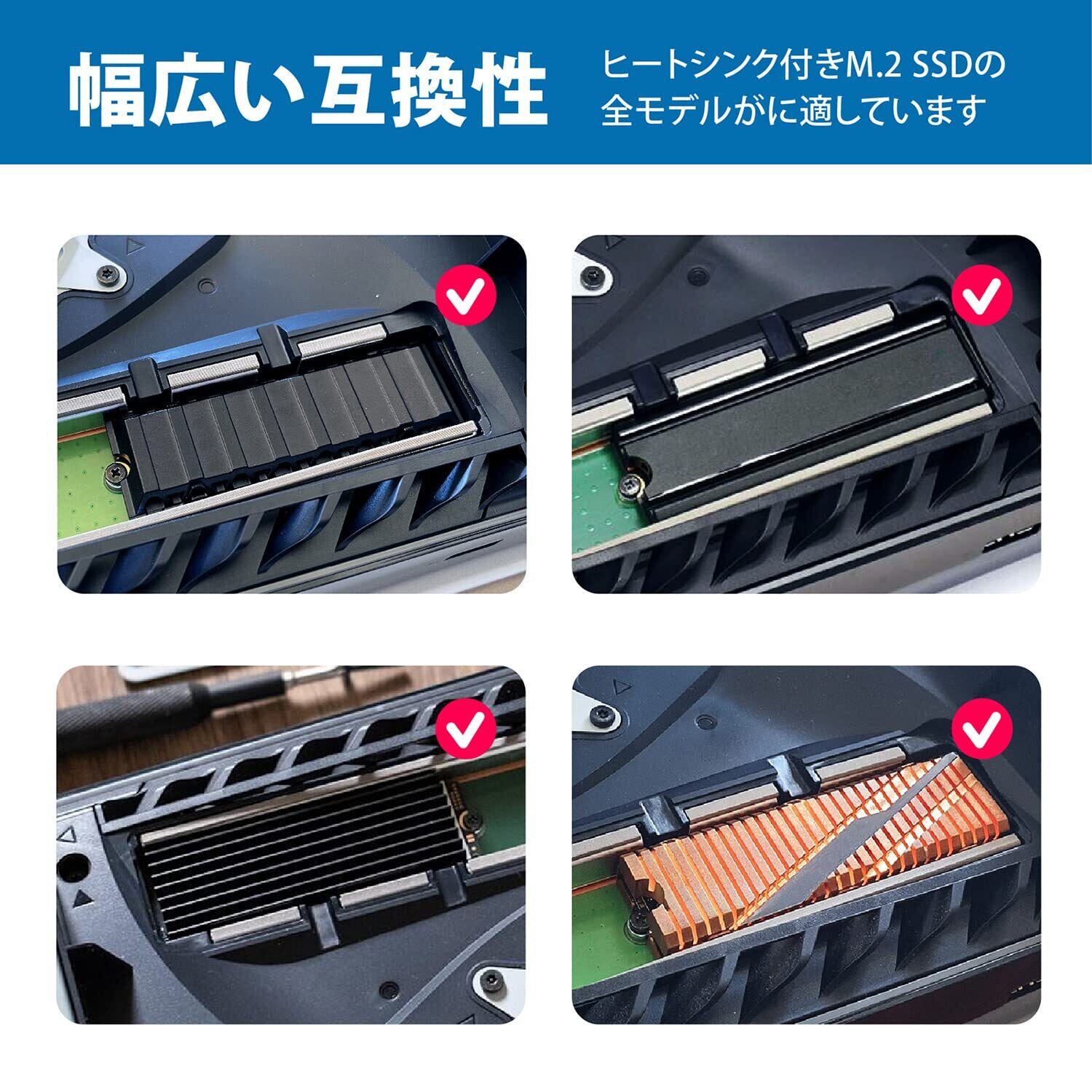 【ヒートシンク付きM.2 SSDが適している】ほとんどのヒートシンクは、ヒートシンクが統合された m.2 SSD には適合しませんでしたが、このカバーはこの目的のために作られています。統合ヒートシンク付き SSD と組み合わせて使用し、SSD を冷却性能を底上げしオーバーヒートを予防します
