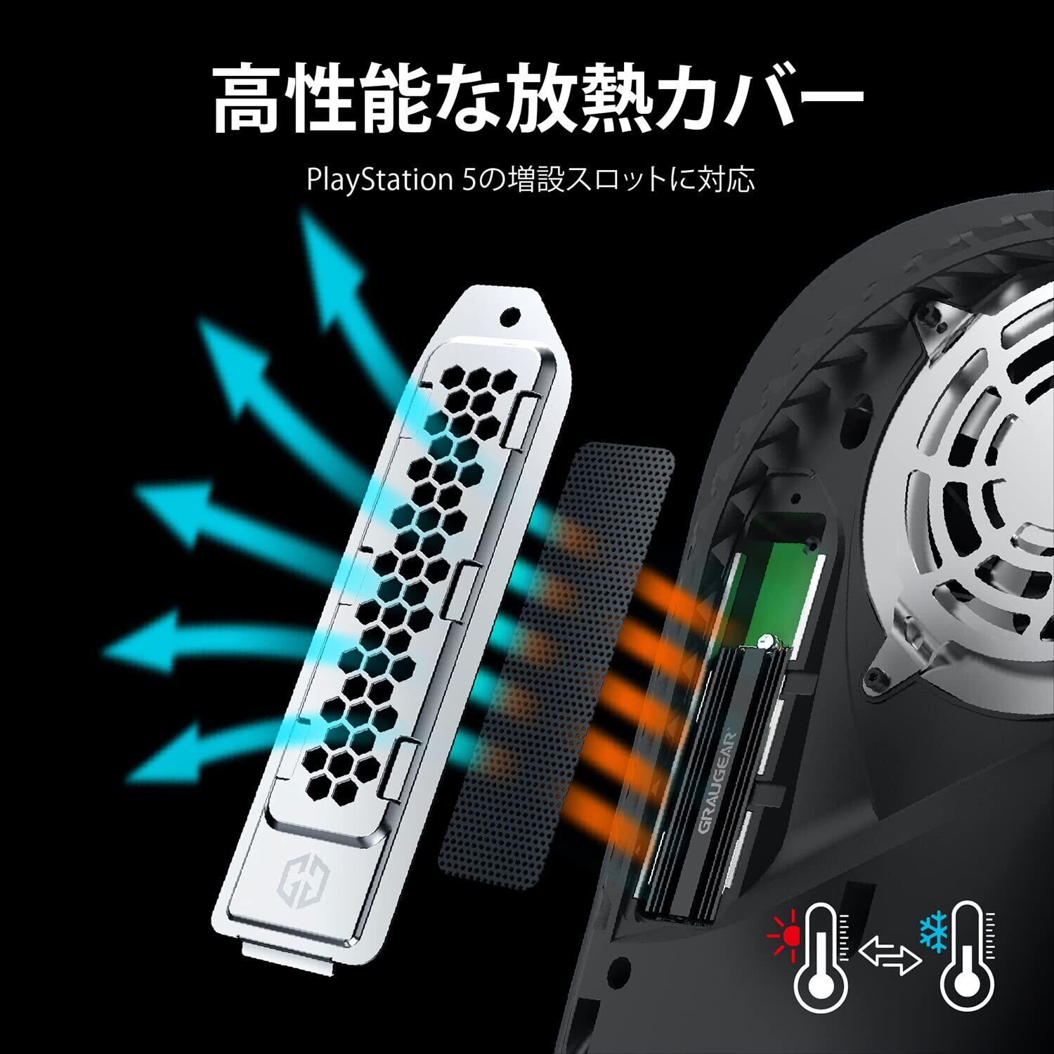 「『GRAUGEAR PS5専用SSDカバーとヒートシンク』は、高度なデザインと機能性を兼ね備えた商品です!PS5の拡張スロットにぴったりフィットし、SSDをしっかり保護しながら、優れた冷却性能を発揮します。」