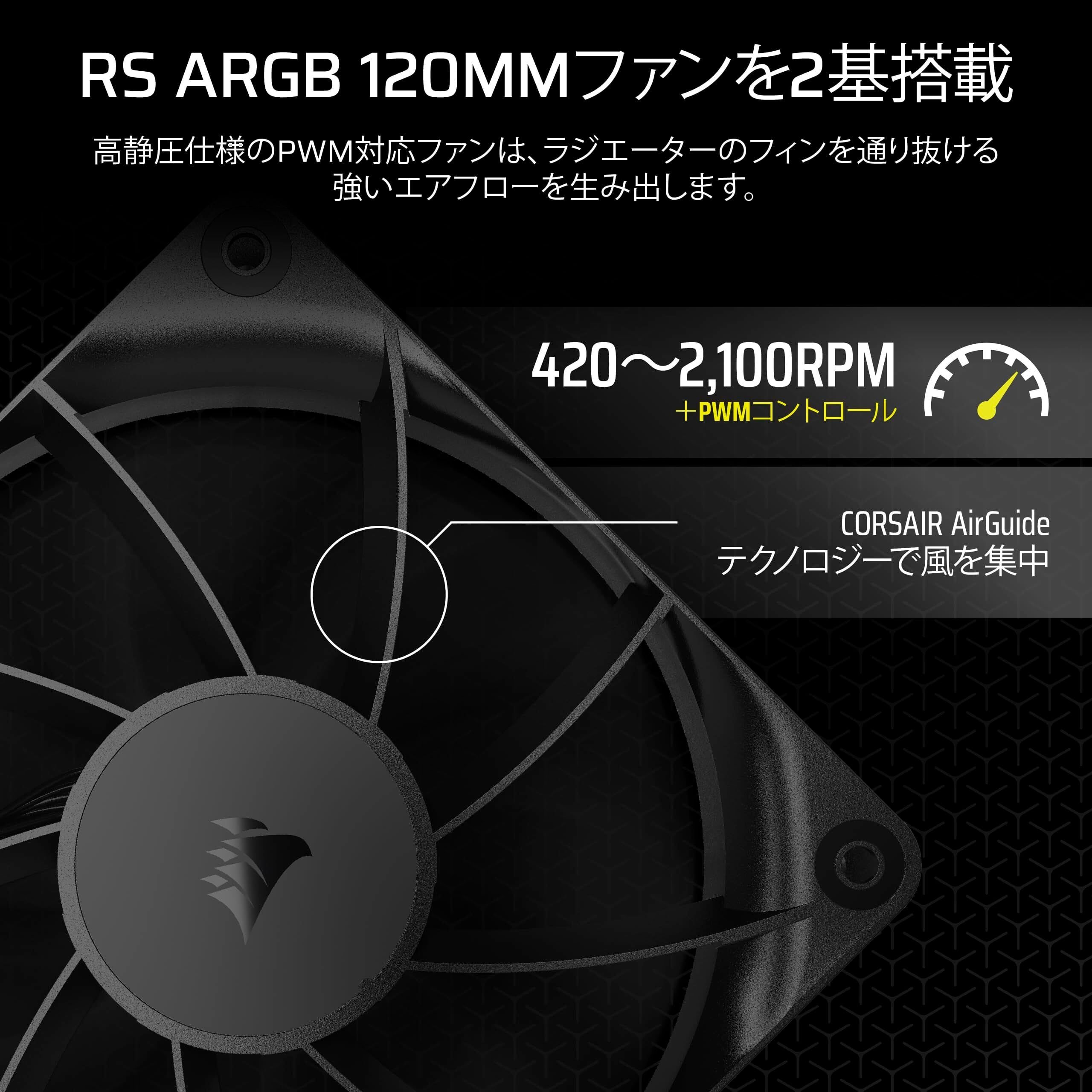 高い静圧を備えるRS120 120mmファンを2基付属しています。エアフローがラジエーターのフィンの間を効率よく通り抜けるには、高い静圧が効果的です。
