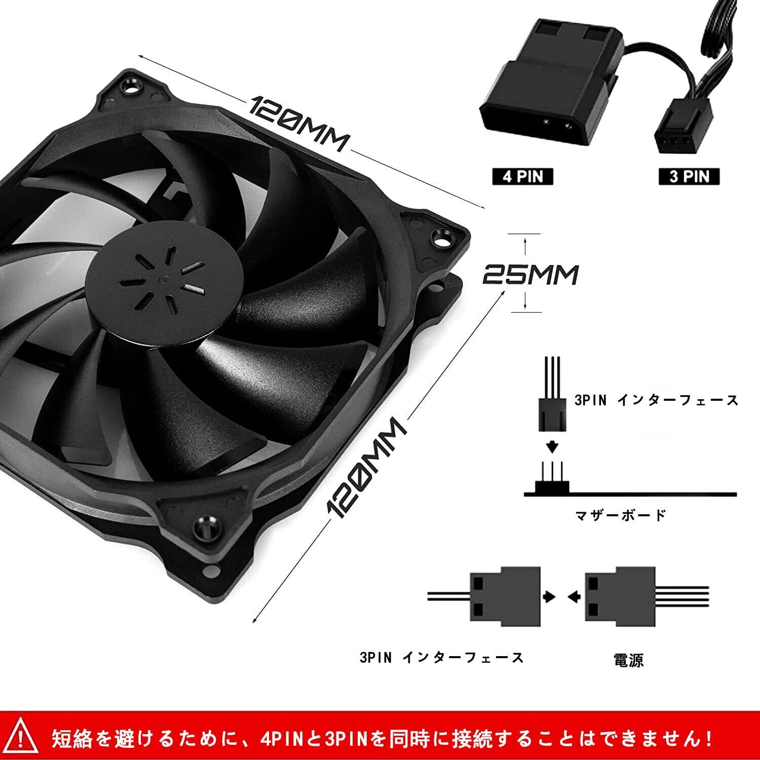 【2分岐ケーブル】電源端子は小さい3ピンとペリフェラル4ピンが付属する、3ピン分岐ケーブルをマザボと接続する。あるいは4ピンペリフェラルを電源と接続する。短絡を避けるために、4ピンと3ピンを同時に接続することはできません。