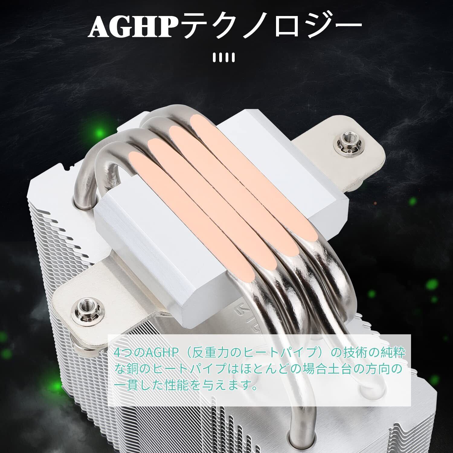 「4本のヒートパイプが熱を素早く取り除き、優れた放熱性能を提供します。これにより、CPUの使用状況にかかわらず、安定した動作温度を維持できます。特に高負荷時でも、そのパフォーマンスをしっかりサポートします!」