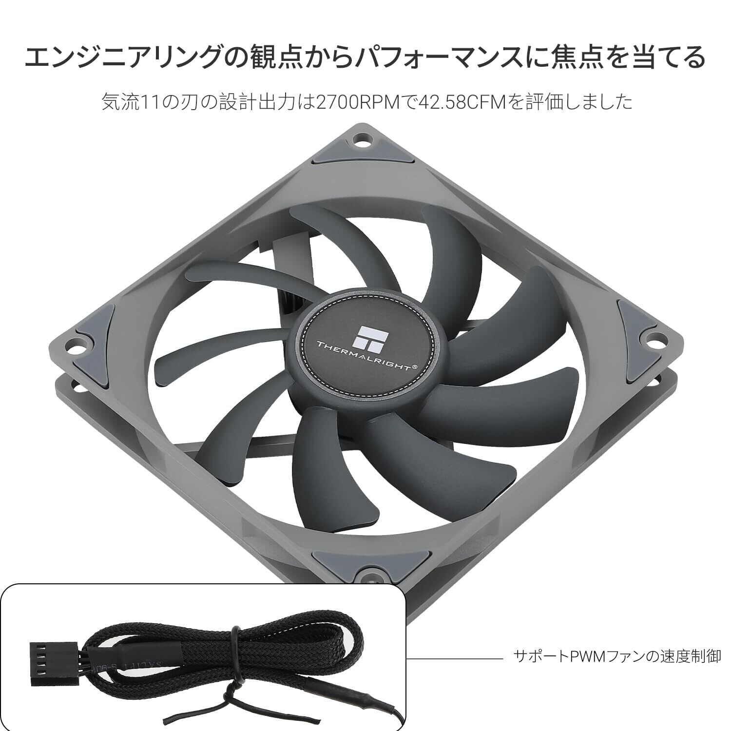 「この92mmファンは、強力な風量を生み出し、CPUの熱を迅速に放散します。最大2700 RPMで、高負荷時にも安定した温度管理をサポートし、スムーズなPC動作を実現します!」