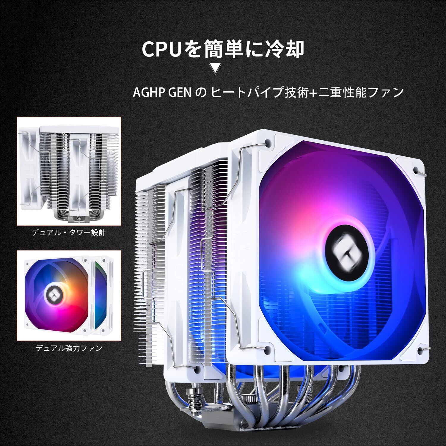 「6本のヒートパイプを利用した設計により、効率的な熱伝導が実現され、CPUの熱を素早く排出します。ファンは高効率なPWM制御により、静音性を保持しつつ、必要な冷却性能を提供します。高負荷の作業環境でも安心してご使用いただけます!」