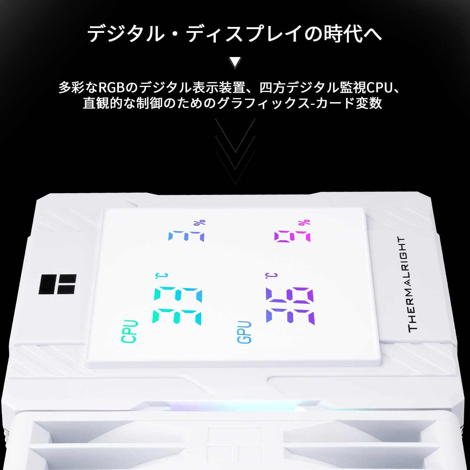 「『Thermalright Peerless Assassin 120 Digital ARGB White』は、最新の技術を取り入れた高性能CPUエアクーラーです!6本のヒートパイプとデジタルスクリーンを搭載し、視覚的な美しさと優れた冷却性能を両立させています。」