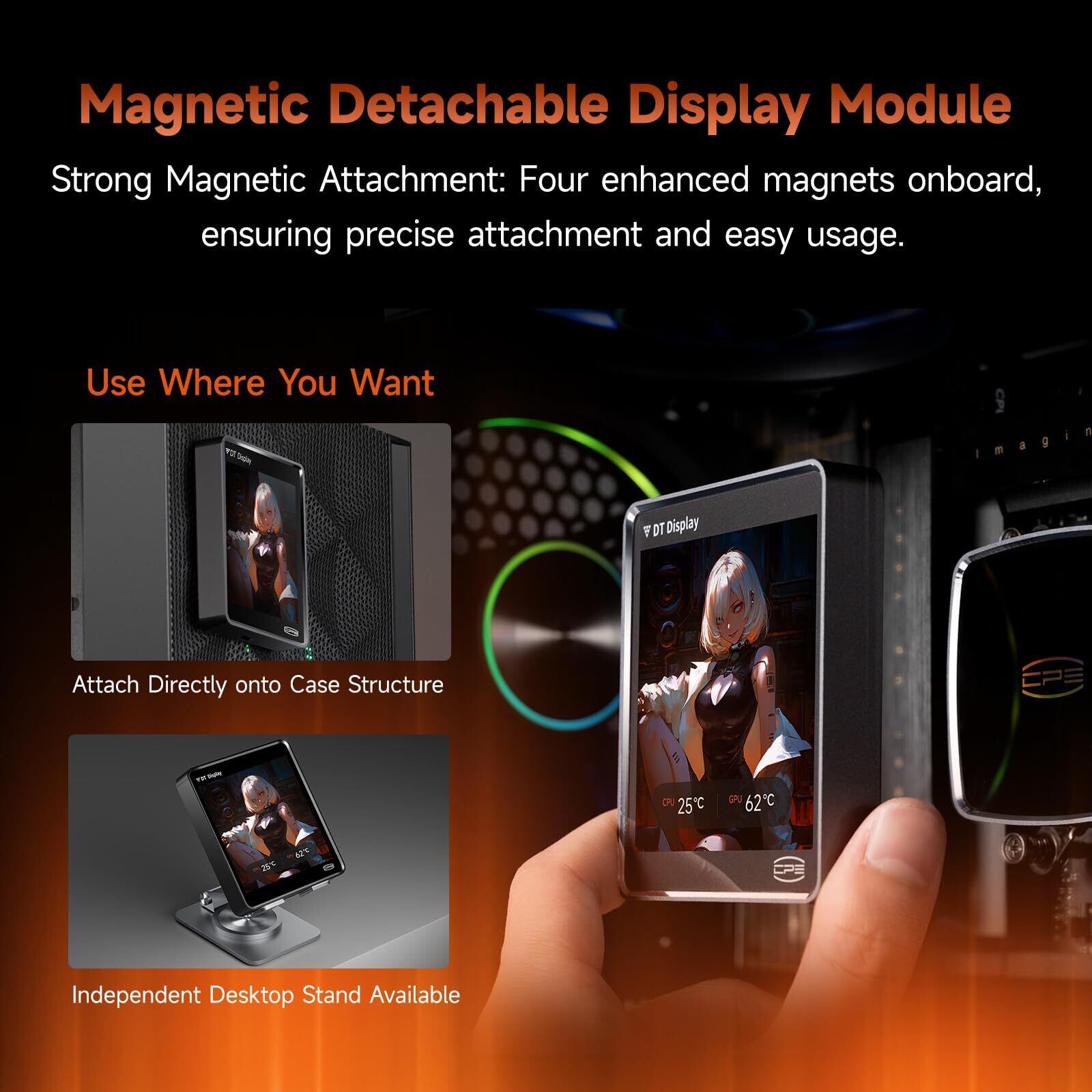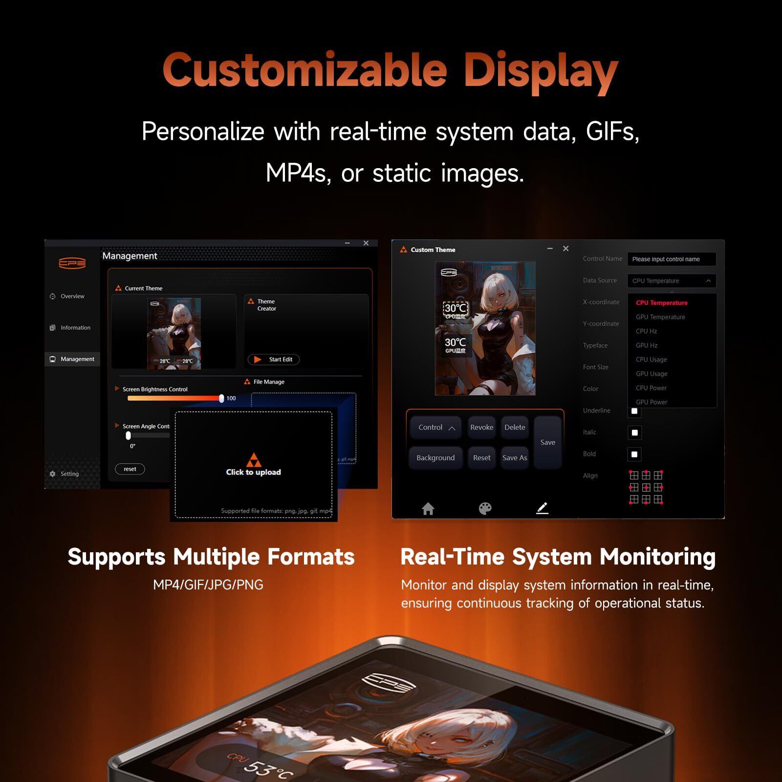 「3.4インチのIPSディスプレイには、ビジュアルの美しさを引き立てるARGBライティングが搭載されており、PCケース内部を華やかに演出します。自由に色やエフェクトを変更することができ、あなたのスタイルに合わせたカスタマイズが可能です。」