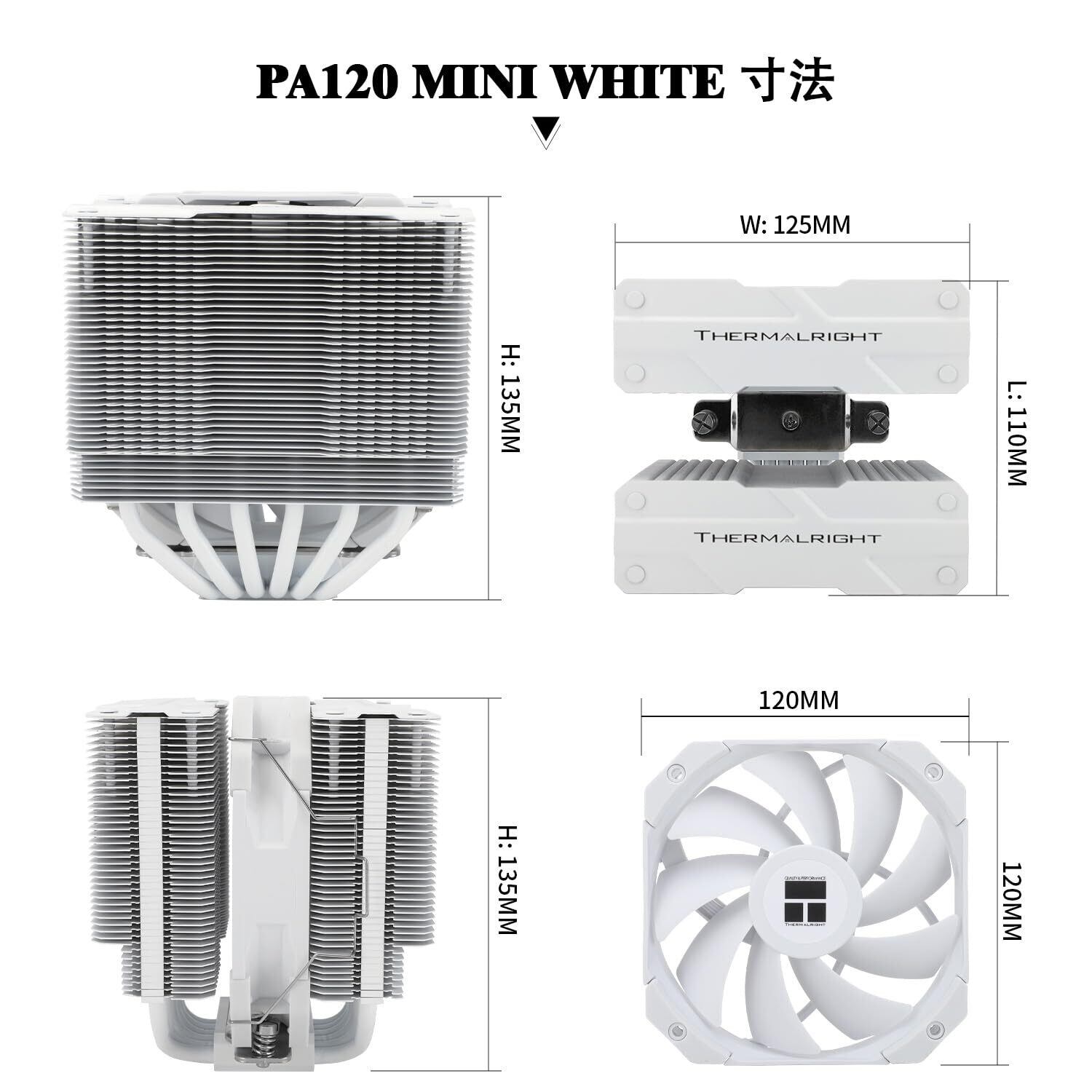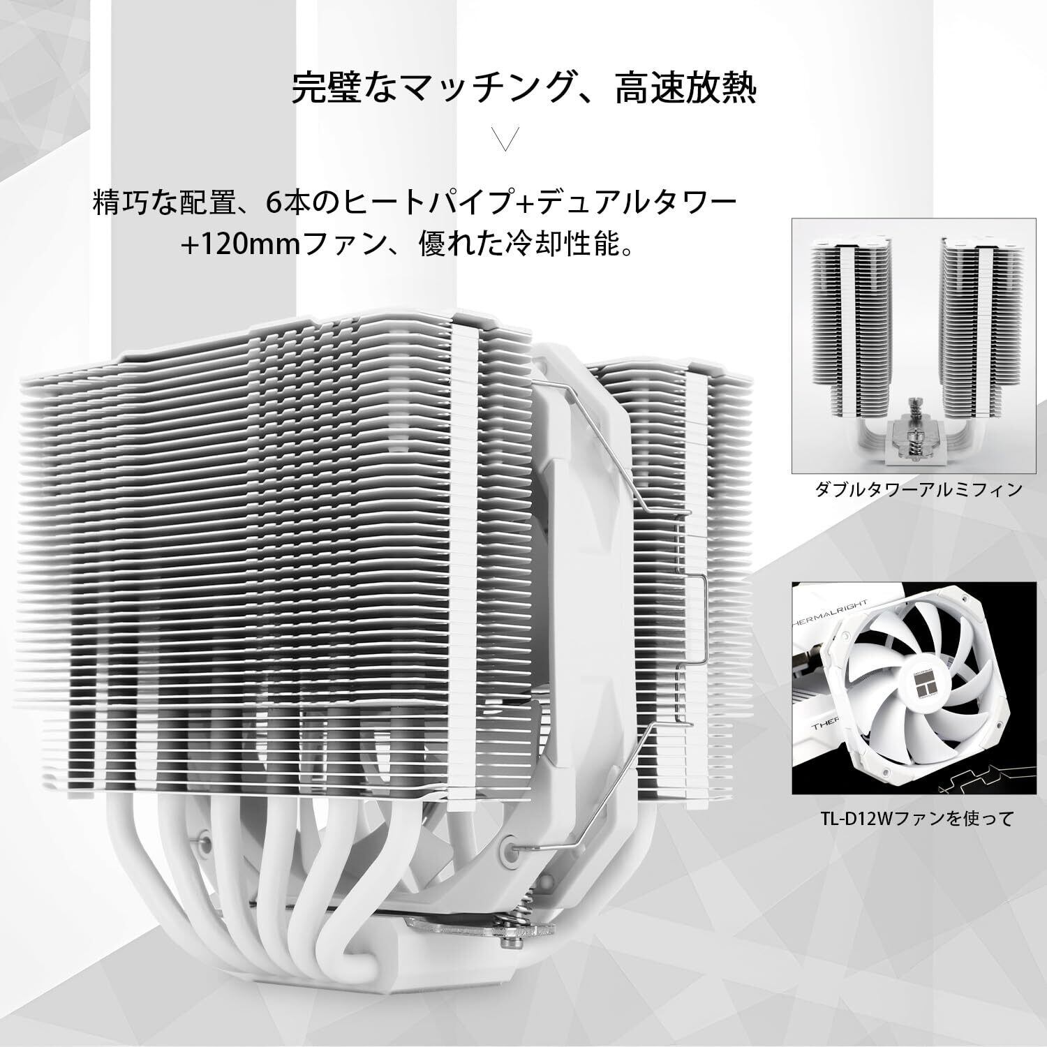 「『Thermalright Peerless Assassin 120 MINI White』は、コンパクトながらも高い冷却性能を兼ね備えたダブルタワーCPUクーラーです!6本のヒートパイプと120mm PWMファンを搭載しており、スタイリッシュなホワイトデザインで、あらゆるシステムにフィットします。」