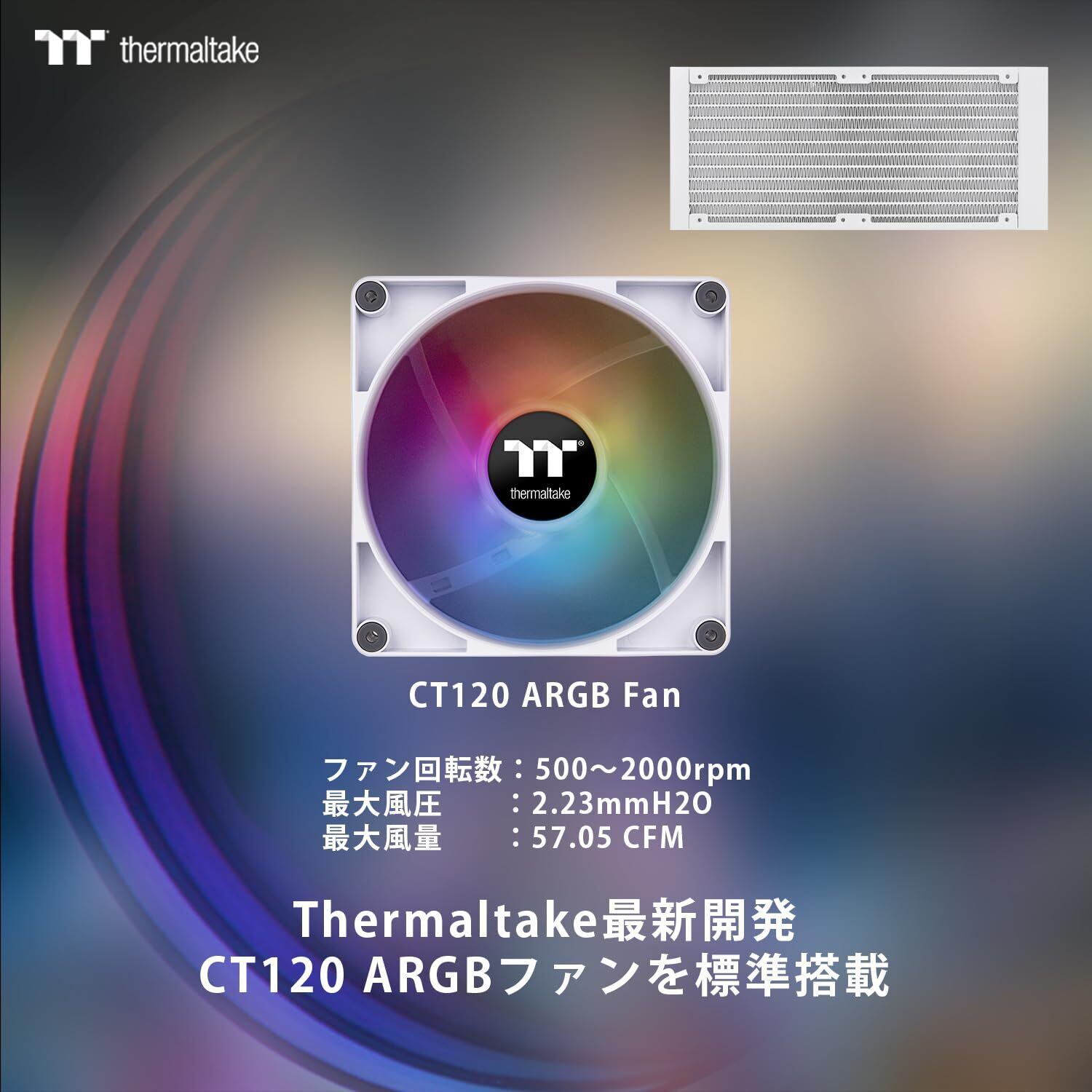 「2基の120mm ARGBファンは、独自のライティング効果を持ち、ドライバーやマザーボードとのシンクロにより、動的で印象的な照明効果を演出します。自分だけのオリジナルなPC環境を楽しむことができます!」