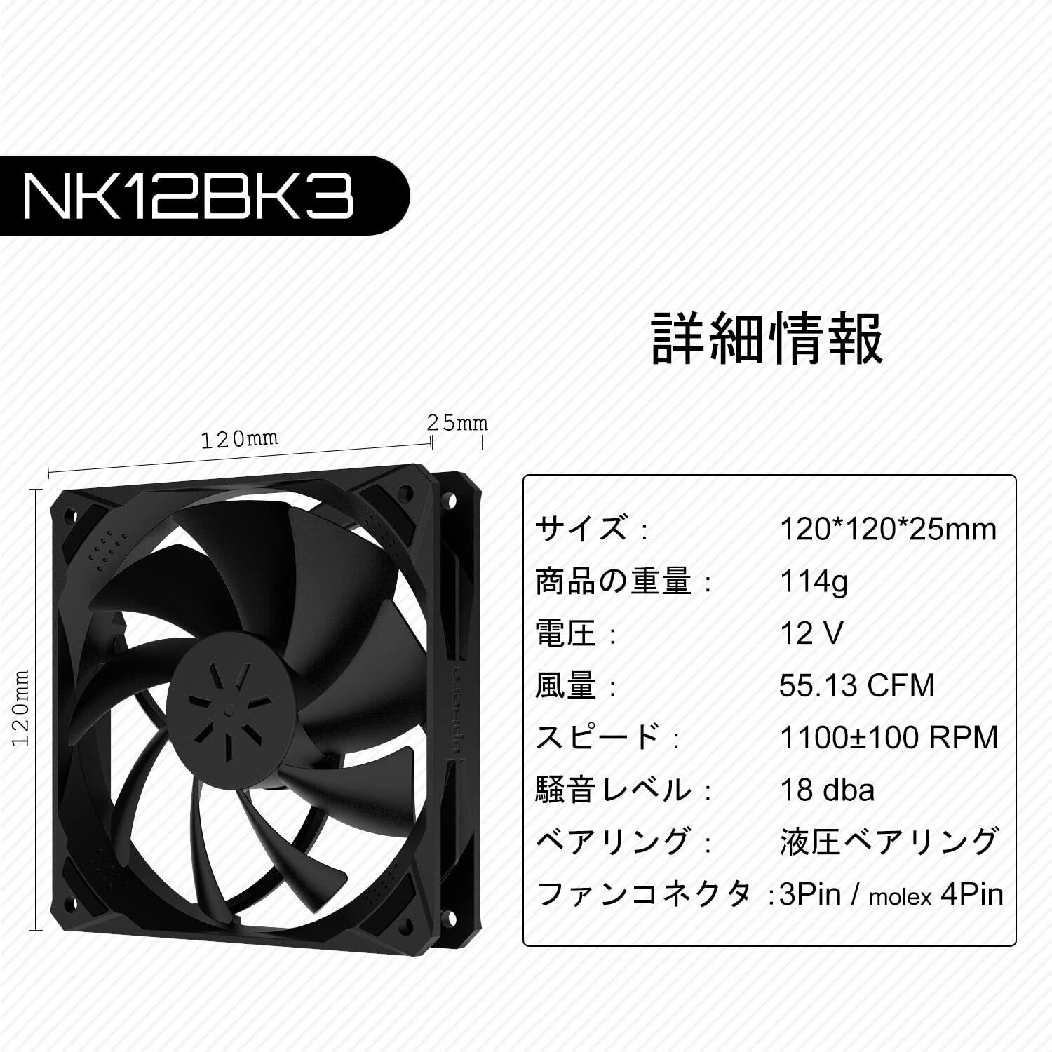 「薄型のデザインと標準サイズの120mmで、ほとんどのPCケースにスムーズに取り付け可能。3ピンコネクタが付属しており、接続も簡単です。」