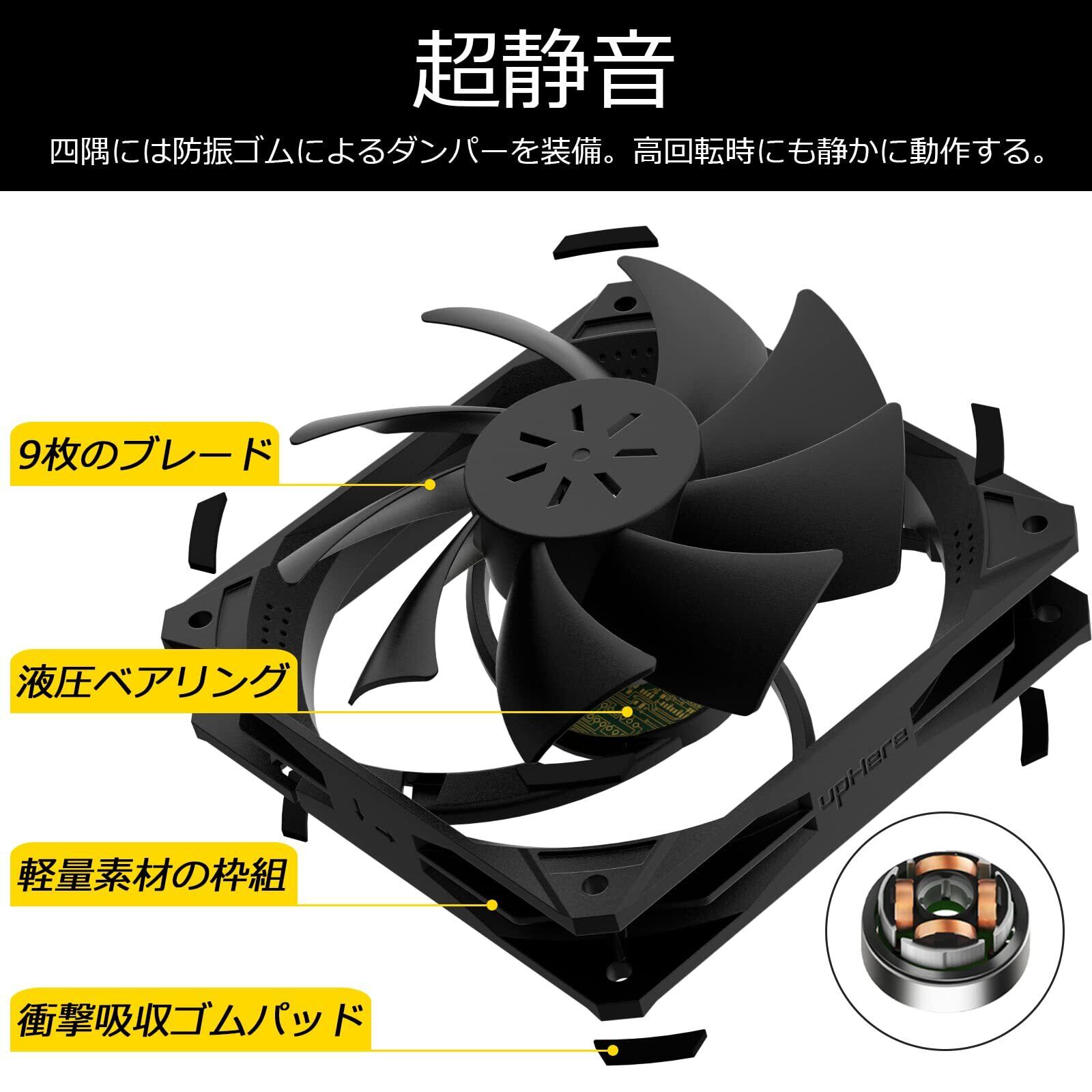 【耐久性に優れた】長寿命の液圧ベアリングを搭載。 耐摩耗性の液圧ベアリング構造により、ファンの騒音をを減らす、風量を増加させます。長寿命で40,000時間連続回転可能です。ご安心してお使いいただけます。