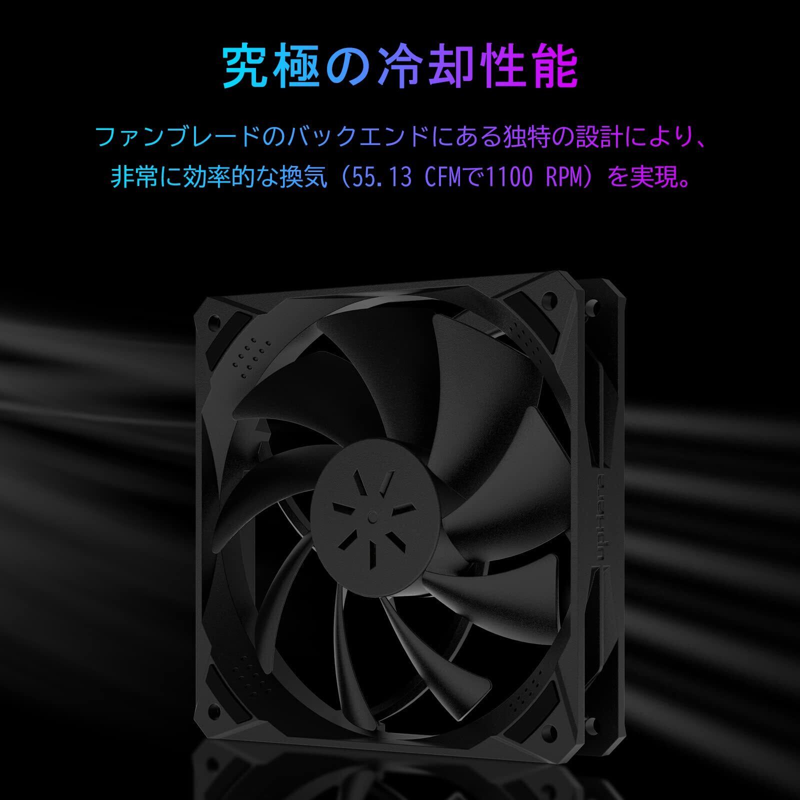 「このファンは、最大回転数が1200RPMに達し、強力なエアフローを提供します。効率的に熱を排出し、長時間の高負荷使用でも安心してお使いいただけます。」