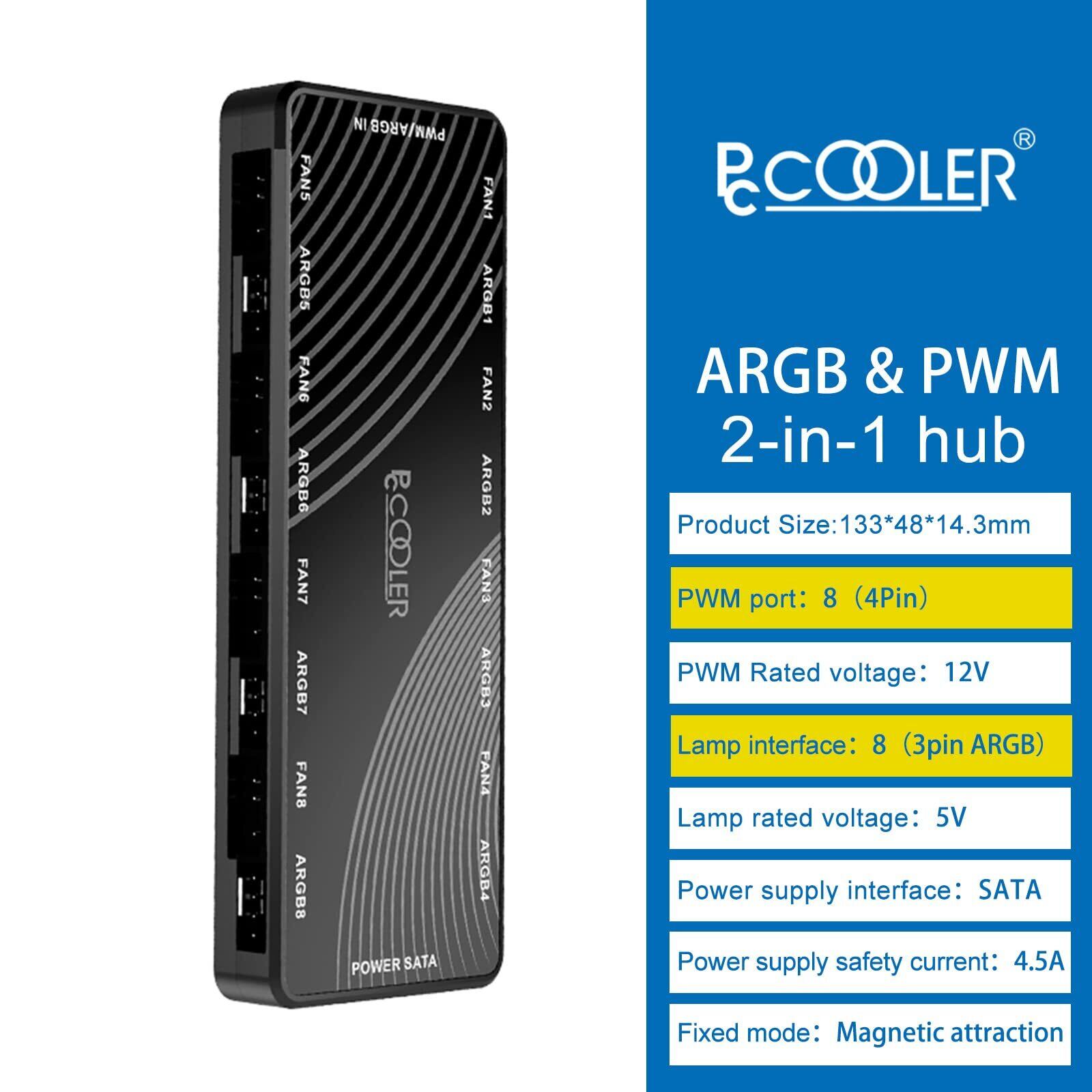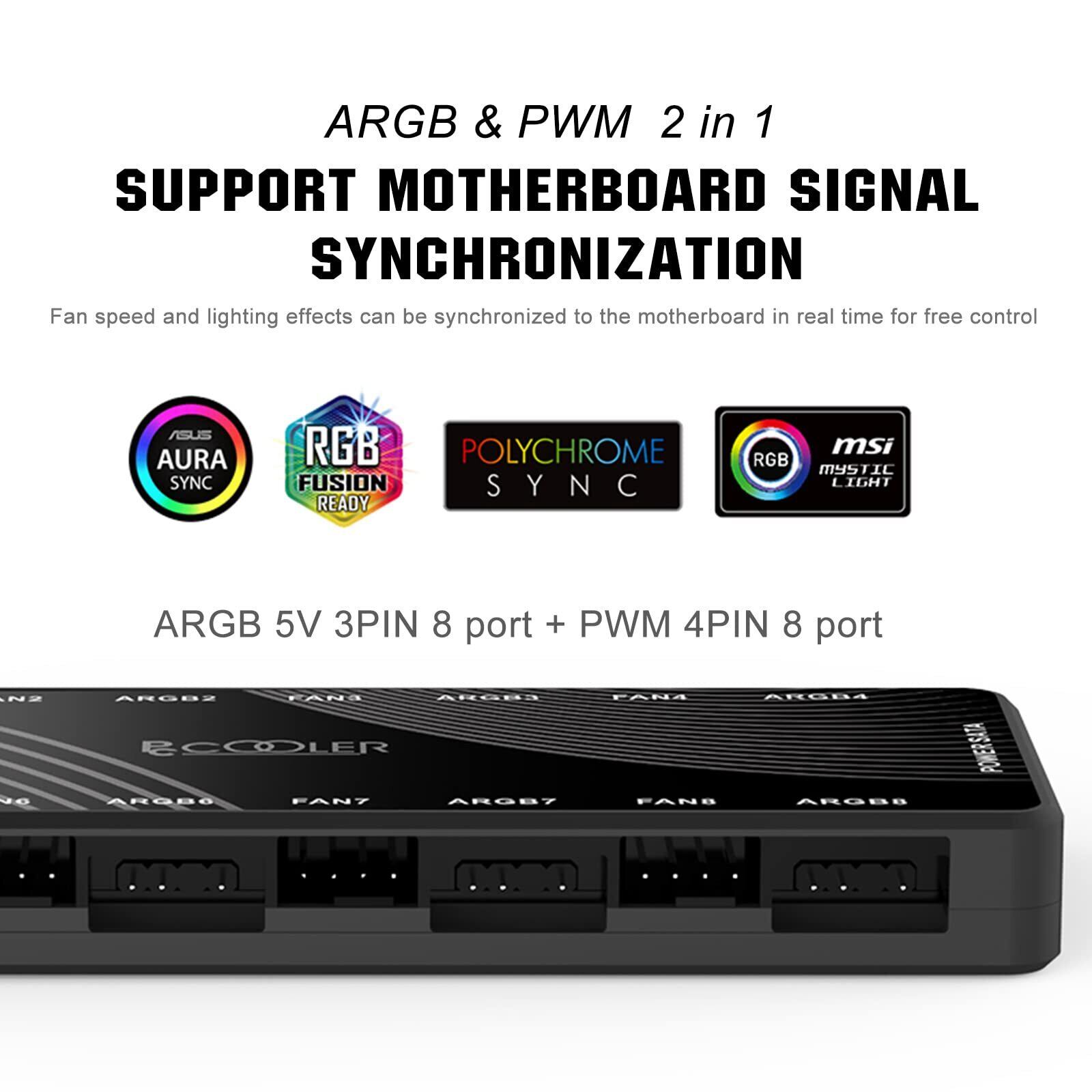 PCCOOLER CPS ARGB ハブ PWM ファンハブ 2-in-1|5V 3ピンARGB & 12V 4ピンPWM|サチ冷電源SATA|隠しマグネット基盤|最大8台ファン対応 RGB ケースファン Case Fan Hub 黒