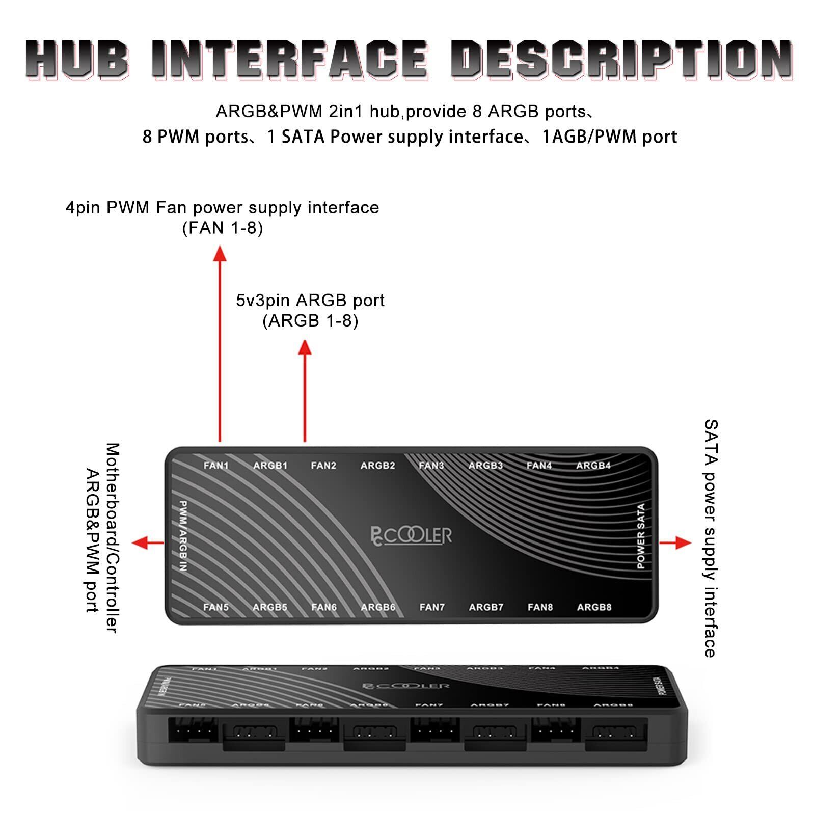 **PCCOOLER CPS ARGB ハブ PWM ファンハブ 2-in-1|5V 3ピンARGB & 12V 4ピンPWM|サチ冷電源SATA|隠しマグネット基盤|最大8台ファン対応 RGB ケースファン - 黒!**