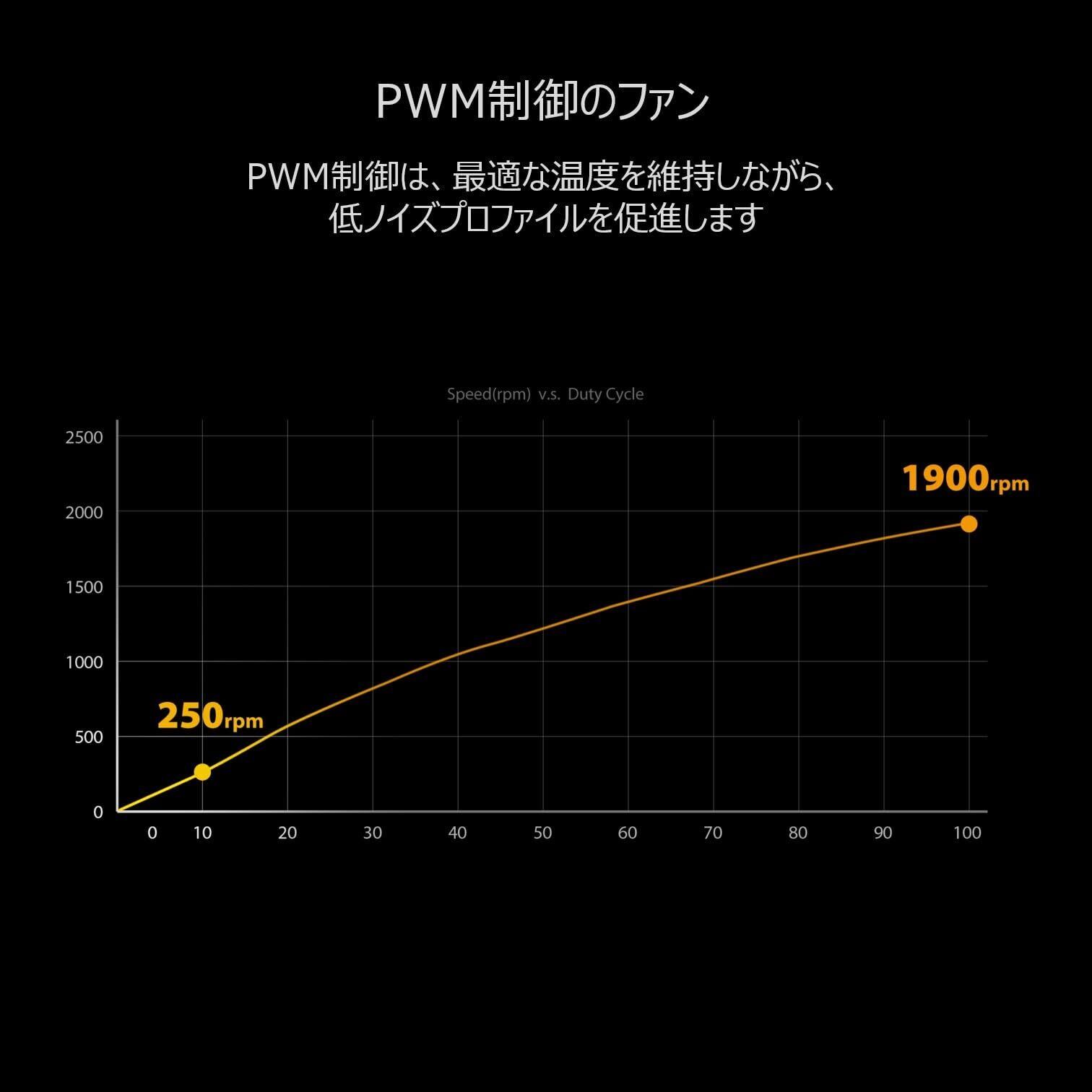 PWM制御:非常に広域な回転数範囲により、あらゆる作業に応じた冷却パーフォーマンスを提供できます。