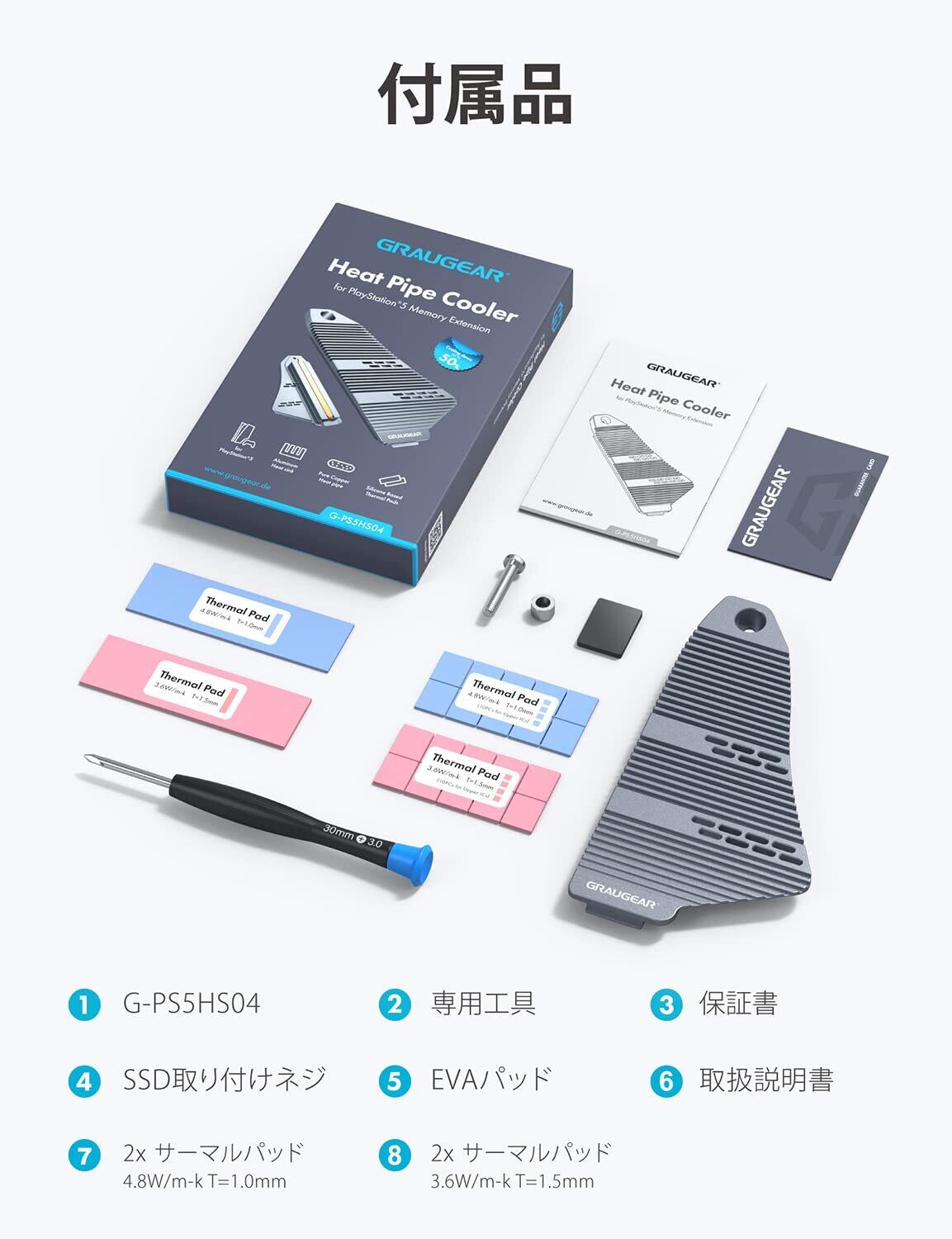 【付属品】GRAUGEAR PS5専用 M.2 NVMe SSDヒートシンク、サーマルパッド(ブルー:1.0mm、4.8W / m-k、ピンク:1.5mm、3.6W / m-k)、ドライバー、ネジ、書、取扱説明書。