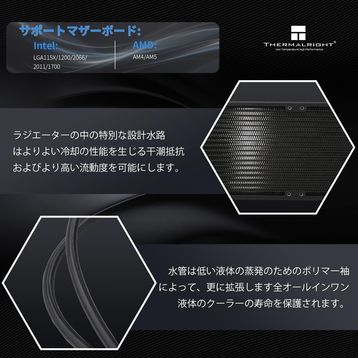 「『Thermalright FW 360 ブラックARGB CPUウォータークーラー』は、パフォーマンスと美しさを両立させた次世代の水冷クーラーです!業務用やゲーミングPCに最適な設計で、冷却性能を最大限に引き出します。」