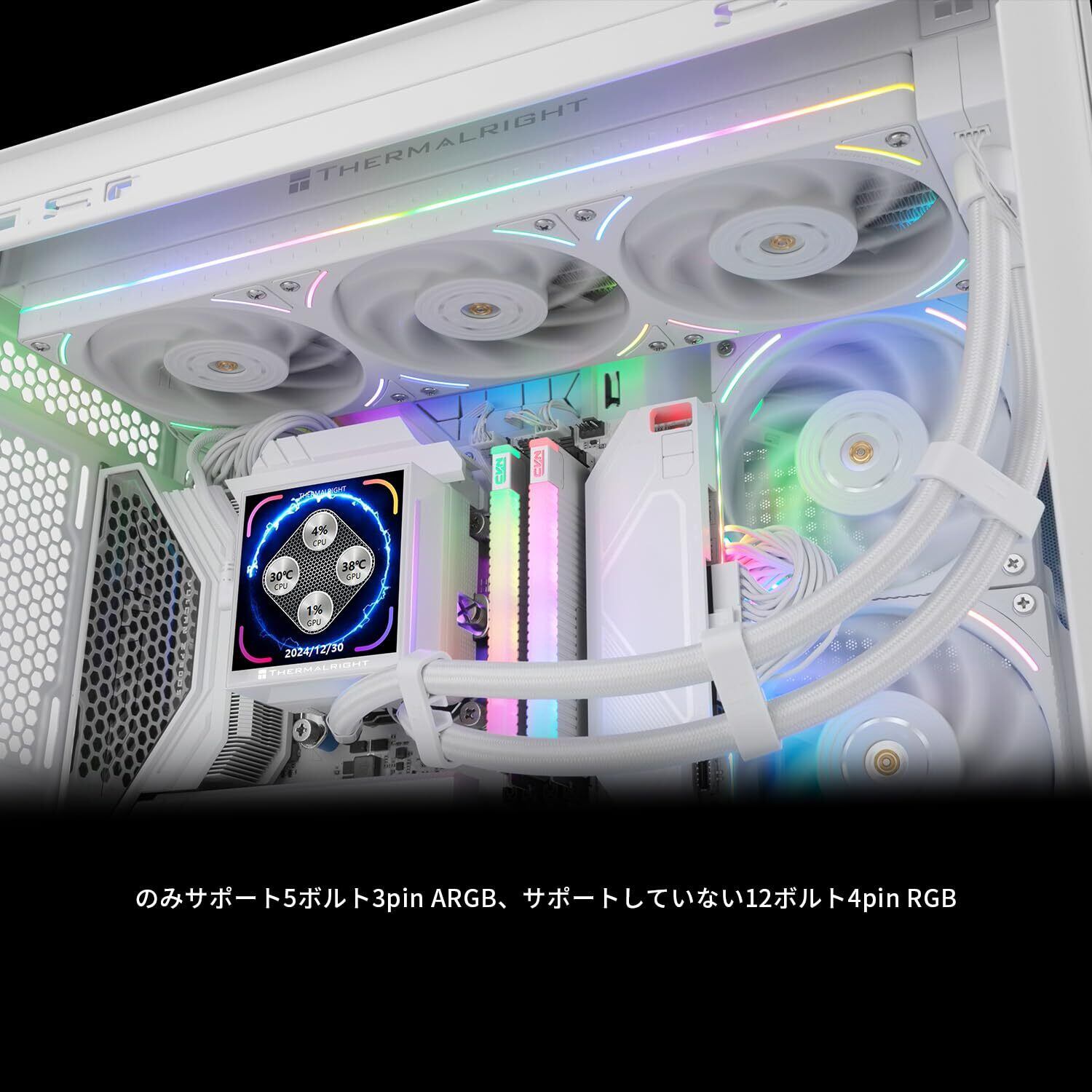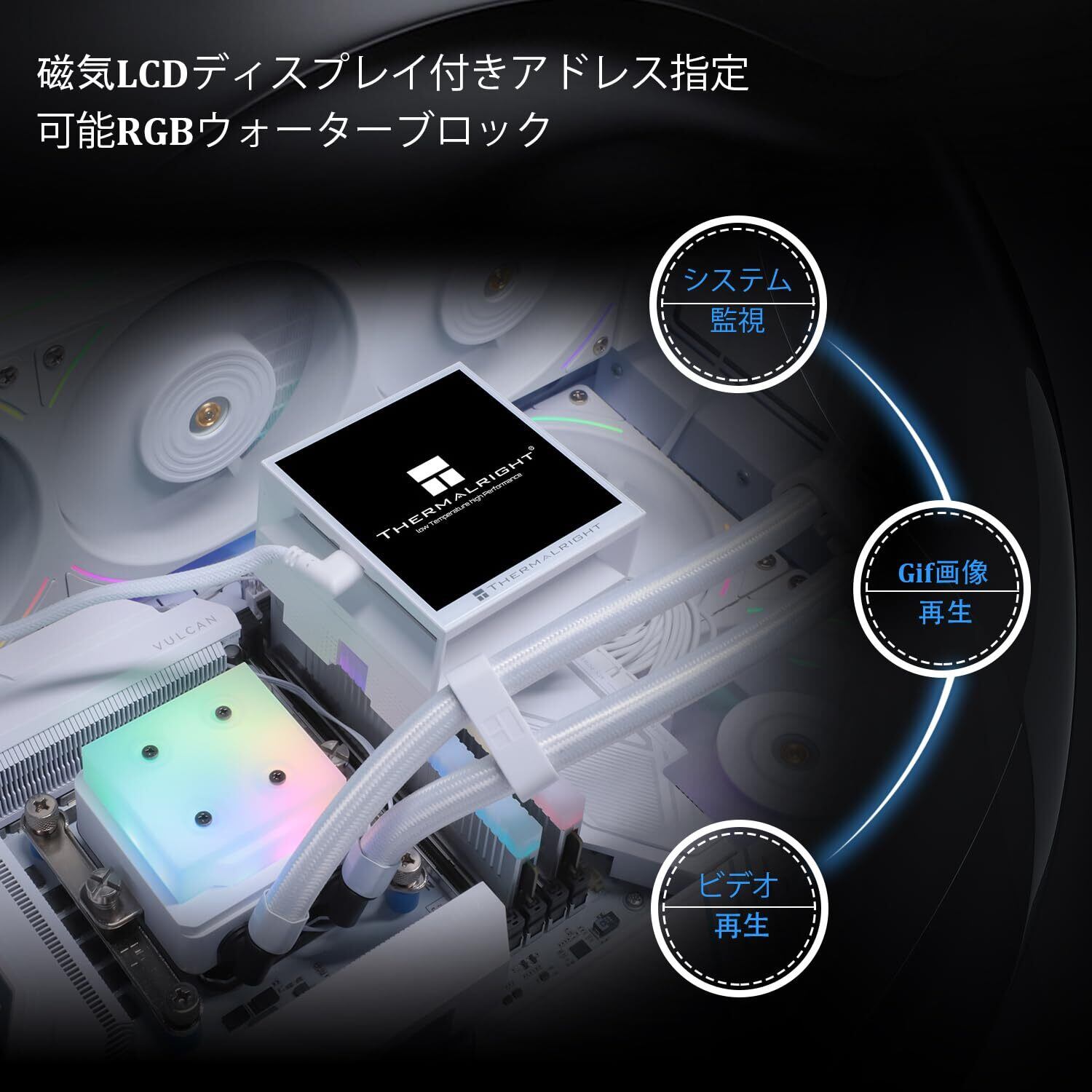 「3.95インチの磁気大画面コールドヘッドは480x480の高解像度を誇り、RGBライティングがPC内部を華やかに演出します。ユーザーの好みに合わせたカスタマイズも可能で、視覚的にも楽しめるクーラーです!」