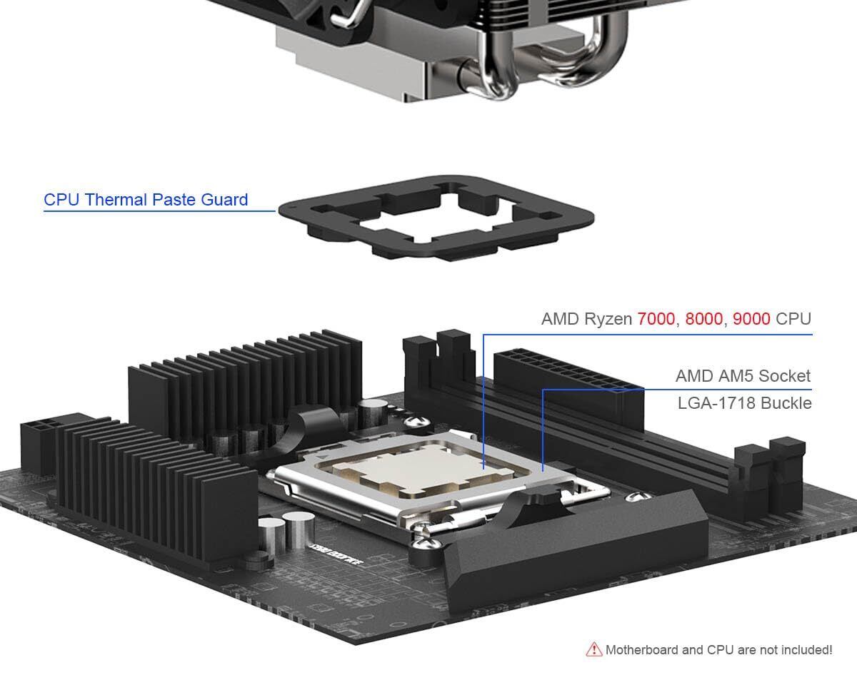 The CPU protector tightly seals the entire CPU along the cut-outs, and it covers LGA1718 fixing buckle and AM5 socket inside, preventing the thermal paste from bleeding onto AMD Ryzen 7000, 8000 and 9000 series processors