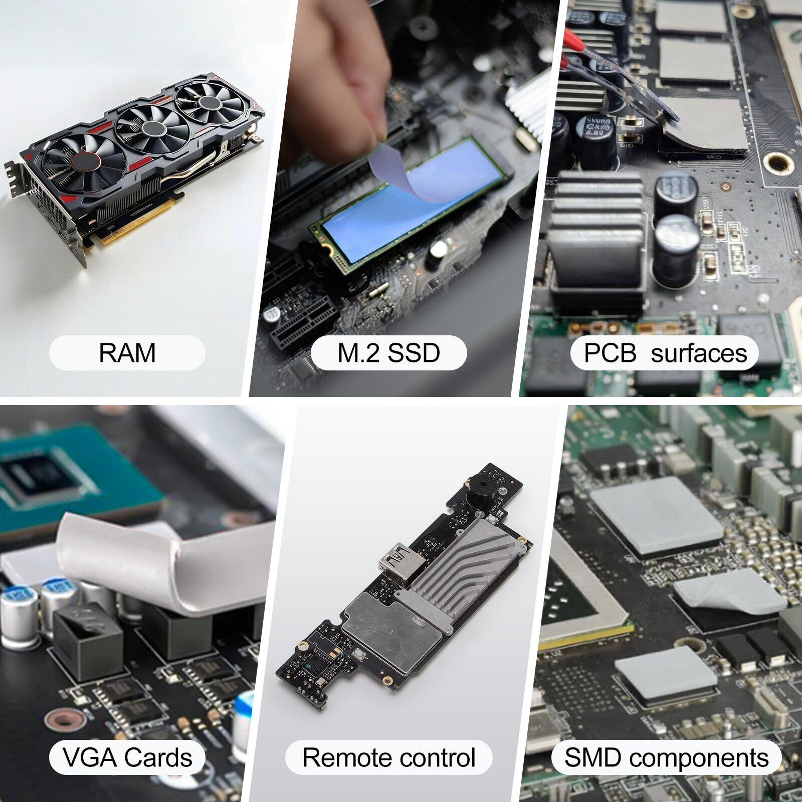 広範な応用:電子PCB表面、コントローラ、CPU、GPU、ヒートシンク、電源、VAGカード、ハードディスク、コンピュータ本体、ノートパソコン、メモリースティック、3080/3090/4080/4090グラフィックカード、ゲーム機、自動車電器、電子レンジ、テレビ、セットトップボックスDC-DC、PDP LED IC SMD DIPなどの冷却モジュールに適用