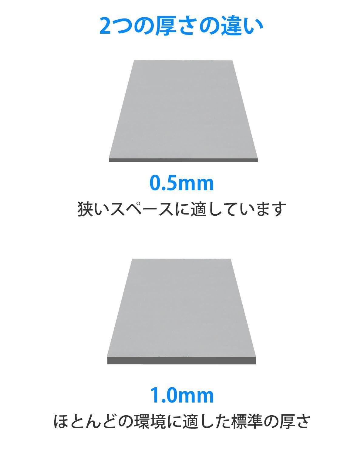 「このシリコンパッドは、2種類の厚さ(0.5mm、1.0mm)を備えており、用途に応じて最適な厚さを選択できます!また、分割線が付いているため、必要なサイズに簡単にカットできる便利さも魅力です。」