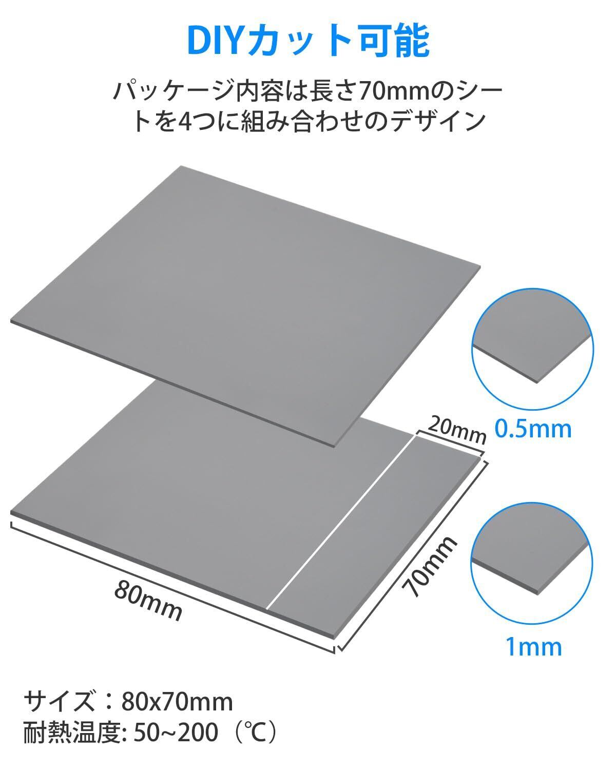 【便利な2サイズ厚み & 分割線カット設計】: 80mm x 70mmサイズの0.5mm厚と1.0mm厚のシリコンパッドが各1枚ずつ、合計2枚セット。表面の分割線に沿って簡単に手でカットでき、70mm x 20mmサイズ等、必要なサイズに調整可能です。