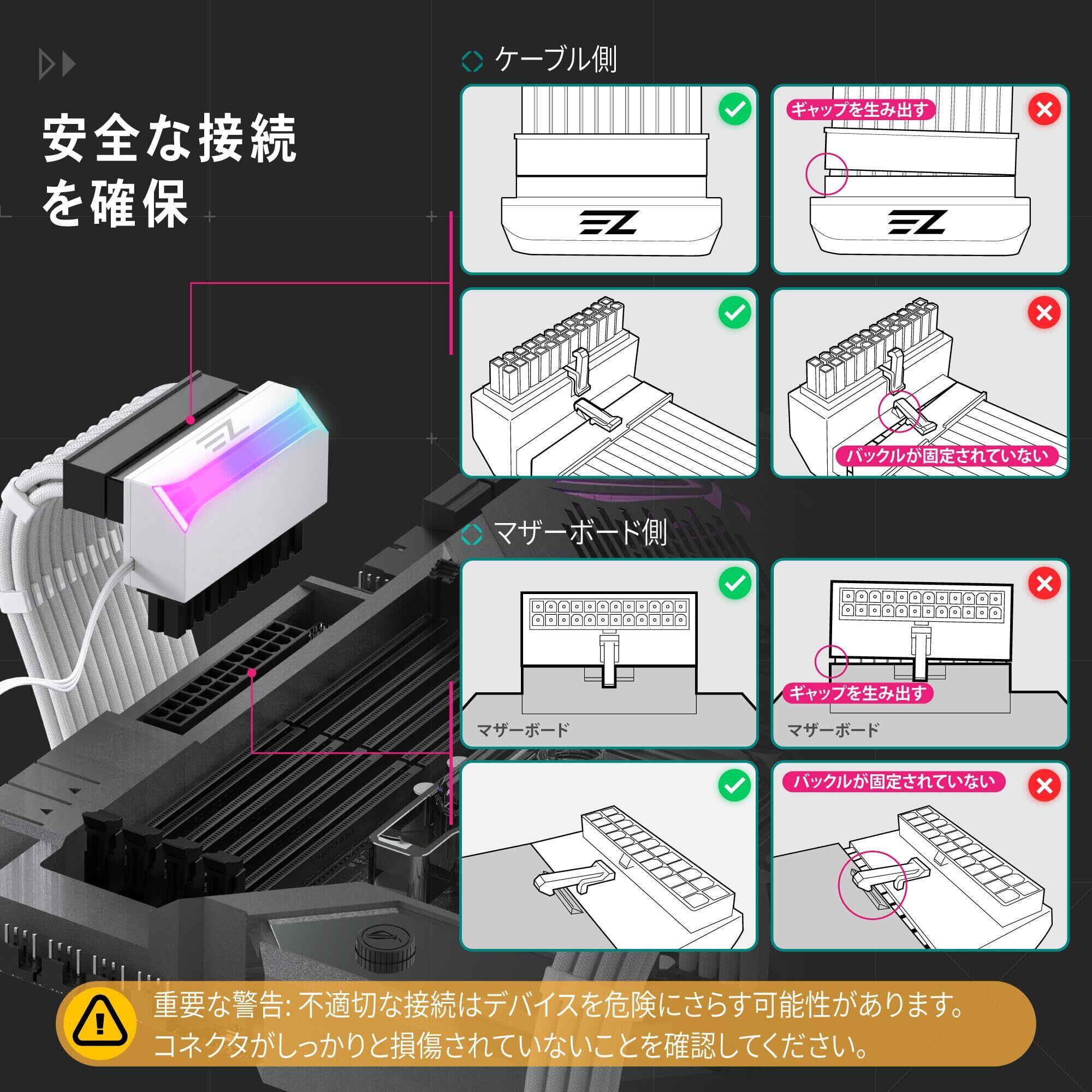 お客様サポート:ご不明点やご質問がございましたら、いつでもお気軽にお問い合わせください。『EZDIY-FAB ATX 24ピン90度電源コネクタ』で、整理された美しい配線を実現し、快適なPC環境を体験してください!