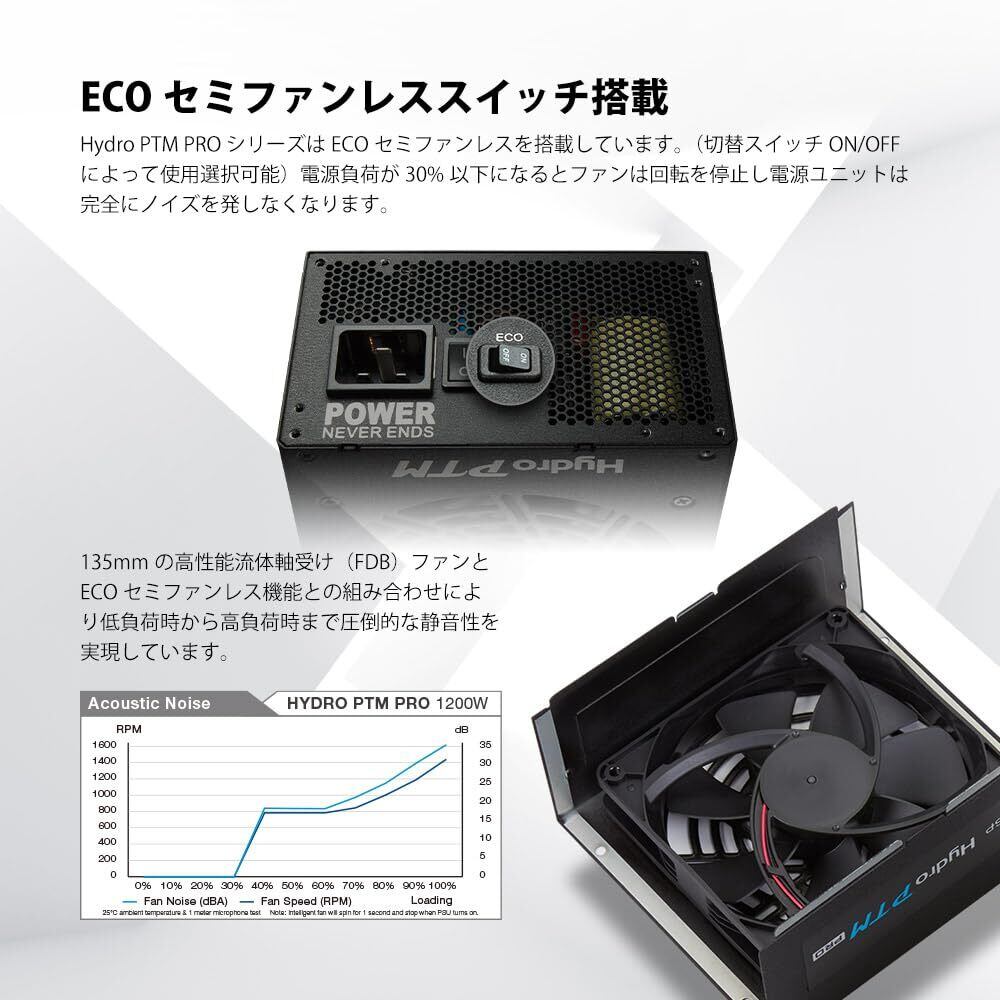 Hydro PTM PRO シリーズ電源は、最新のATX12V V3.0に準拠し、12VHPWRコネクタを備え、最新の世代のプラットフォームに対応した電源です。 高効率の80 Plus(R) Platinum認証を取得し、サーバーグレードのメインボードが高い変換効率を持続させます。 フルブリッジLLC方式DC-DCコンバータ設計により出力電圧の変動率は±1%未満を維持。一次側の450V、105°Cの日本製メインバルク・コンデンサを搭載することで、高い変換効率の上で優れた安定動作を実現します。また、エコモードボタンを搭載しているため構成や環境によってはセミファンレス動作で限りなく静音運用を行うことも可能で、様々なロケーションで最適な選択肢の一つとして提案できます。さらに、独自の「OFf-Whet」テクノロジーも搭載しており、各種の保護機能を踏まえて優れた信頼性と高いパファオーマンスをテストし、10年も付与して安心して使える製品となっています。