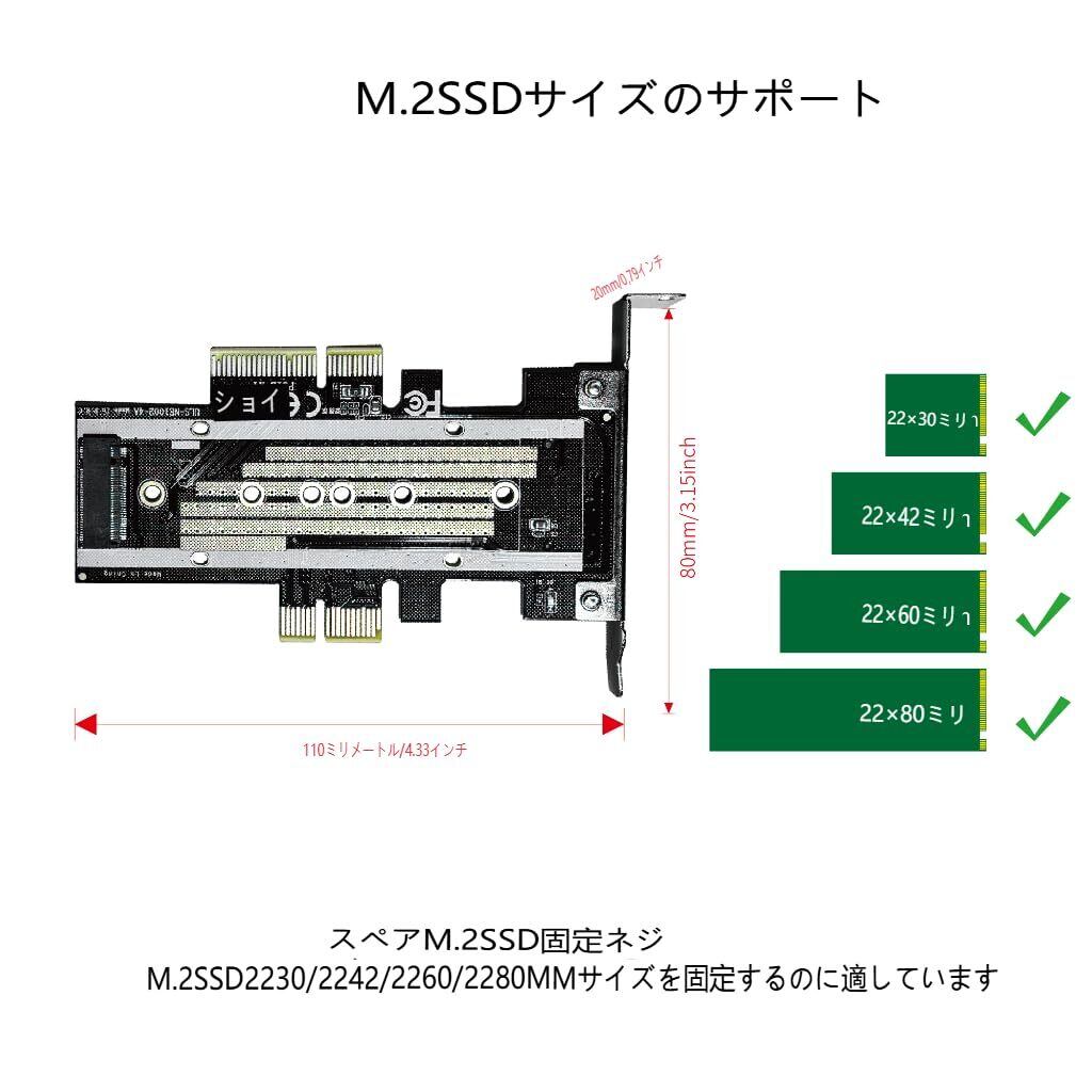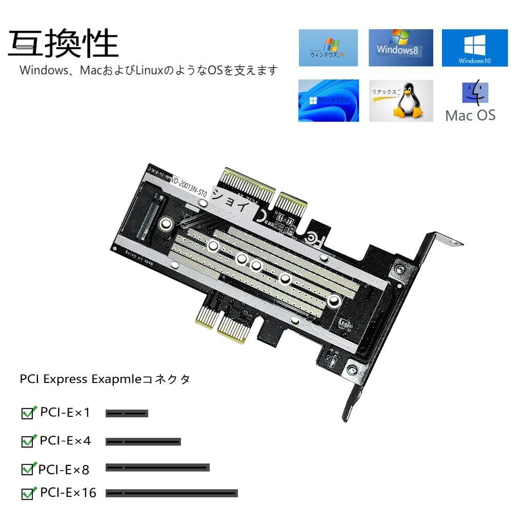「PCI X1、X4、X8、X16スロットをサポートしており、様々なシステム構成に柔軟に対応します!2230、2242、2260、2280の各サイズのSSDに対応しているため、幅広い選択肢からお好みのストレージを選べます。」