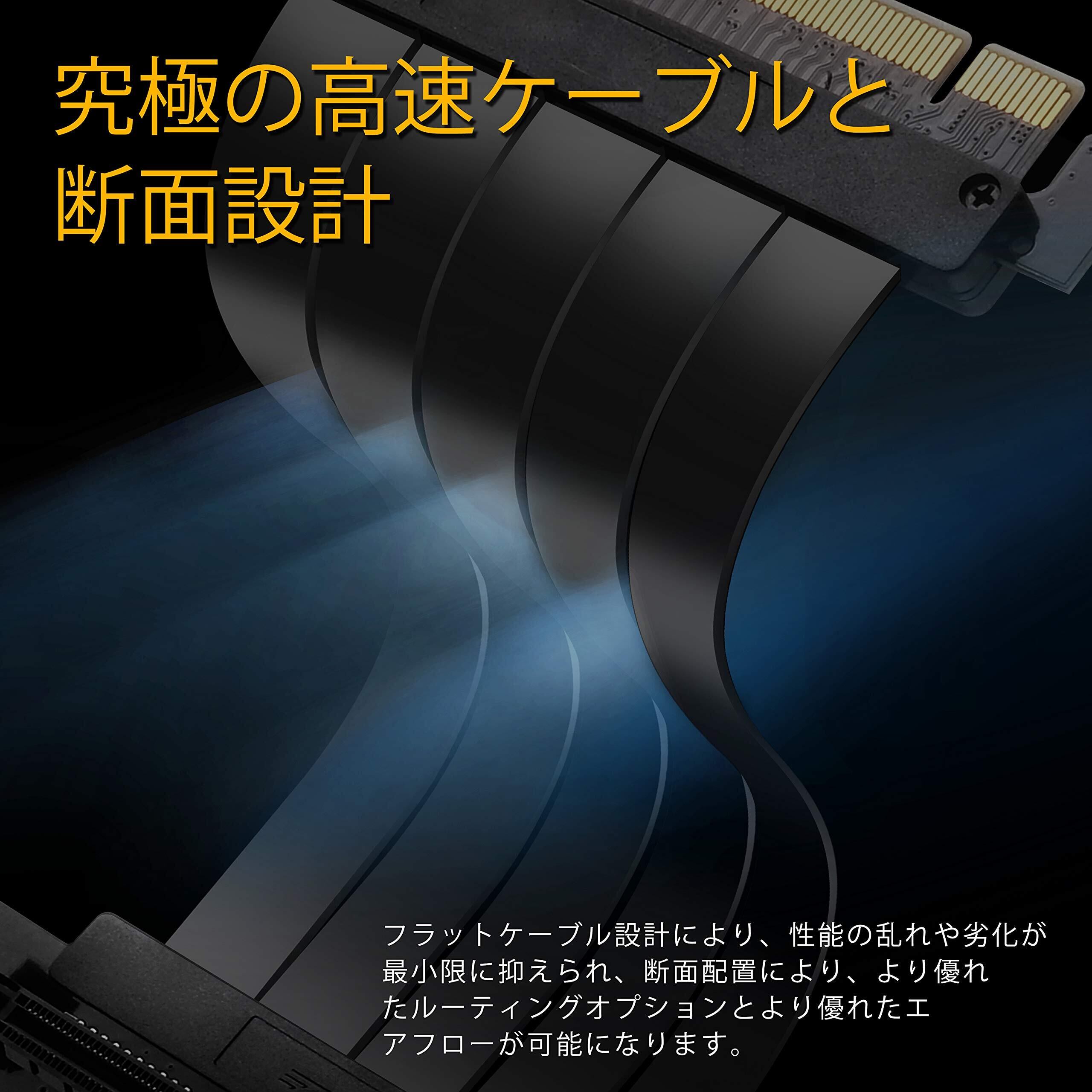 「『EZDIY-FAB PCIeライザーケーブル』は、GPUの拡張を簡単に実現するための高性能ライザーケーブルです!20cmの長さと180度のストレートコネクタ設計により、さまざまなケースレイアウトに対応し、安定した接続を提供します。」
