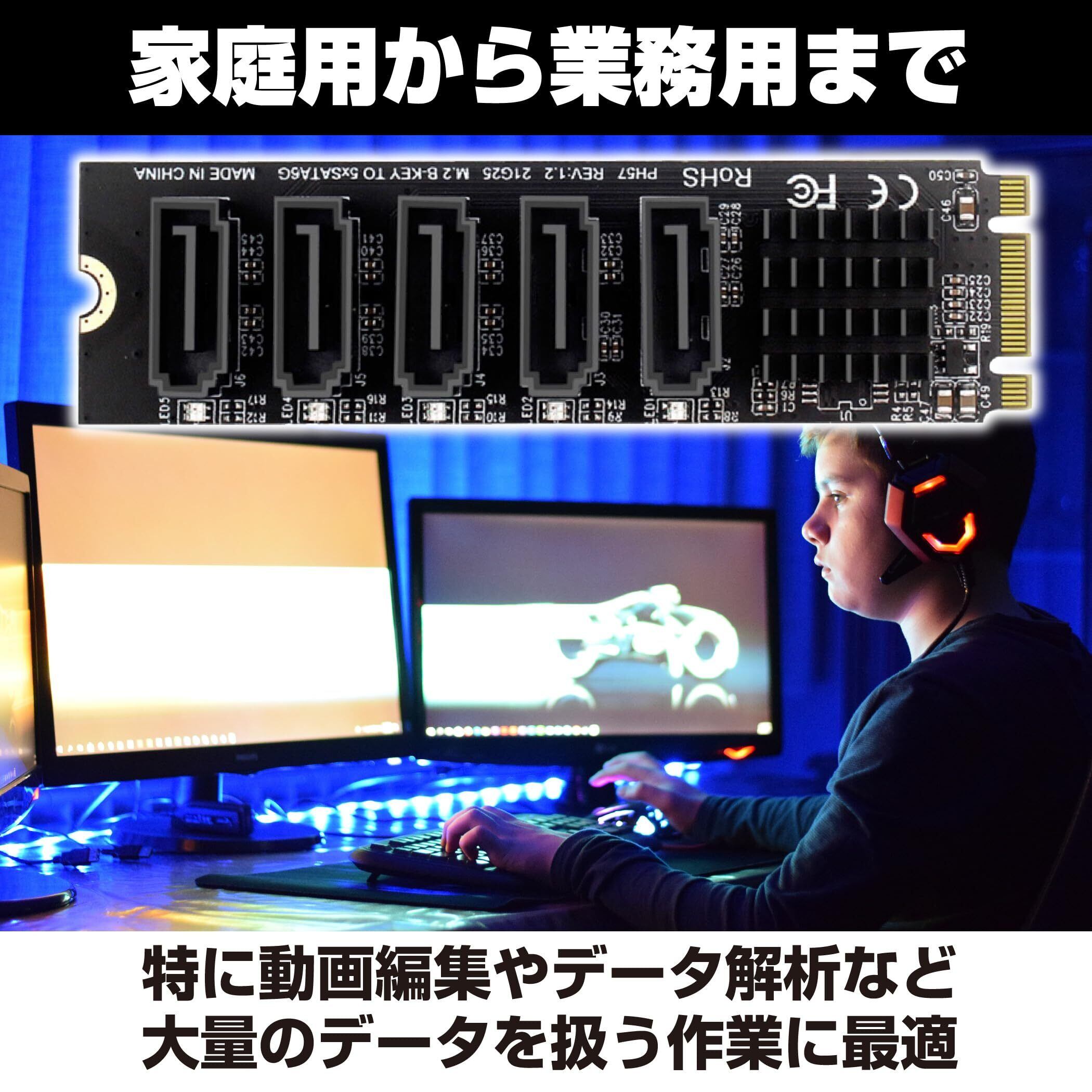 高速データ転送:5台のSATAデバイスの高速転送を実現するSATA3、6Gbps拡張カードです。大容量データの転送やバックアップが迅速かつ効率的に行えます。特に動画編集やデータ解析など大量のデータを扱う作業に最適です。