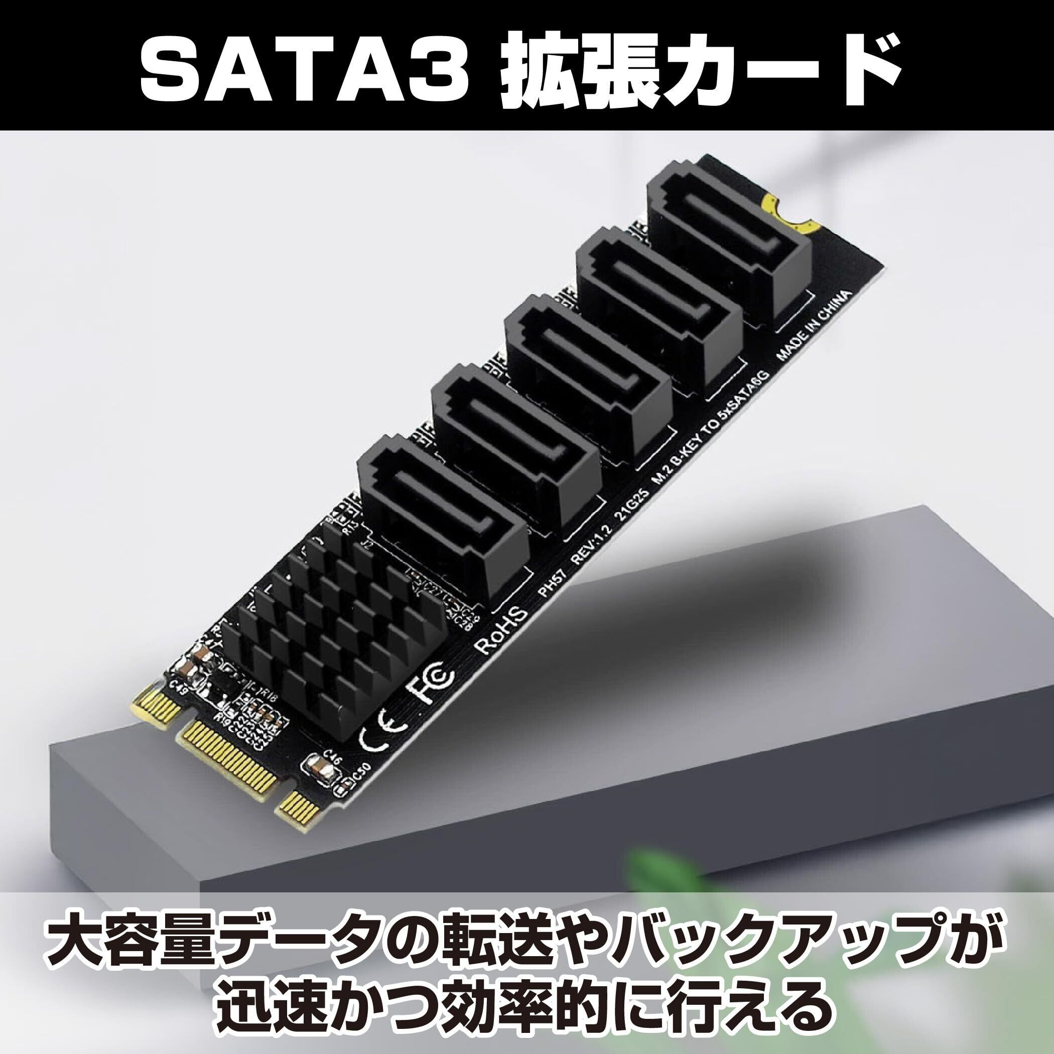 多用途な接続:5つのSATA3ポートを備えており、複数のデバイスを同時に接続できます。これにより、ストレージの拡張や複数のハードドライブの管理が容易になります。家庭用から業務用まで、幅広い用途に対応します。例えば、NASやサーバーの構築にも役立ちます。
