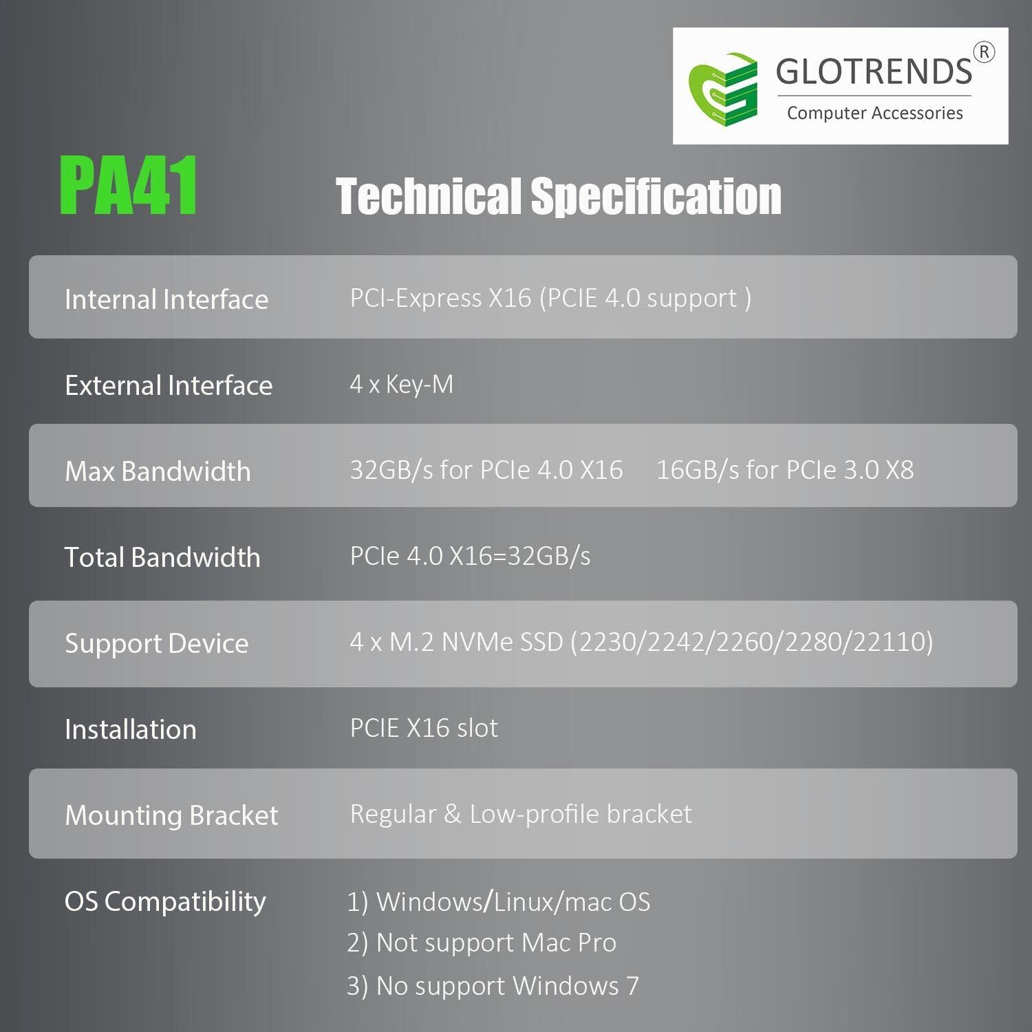 GLOTRENDS PA41 4ポート M.2 NVMe - PCIe 4.0 X16変換 拡張カード、PCIe分岐機能なし(MBはPCIe分岐機能をサポートすること)、M.2 NVMe SSD Soft-RAID対応、22110/2280/2260/2242/2230サイズ対応