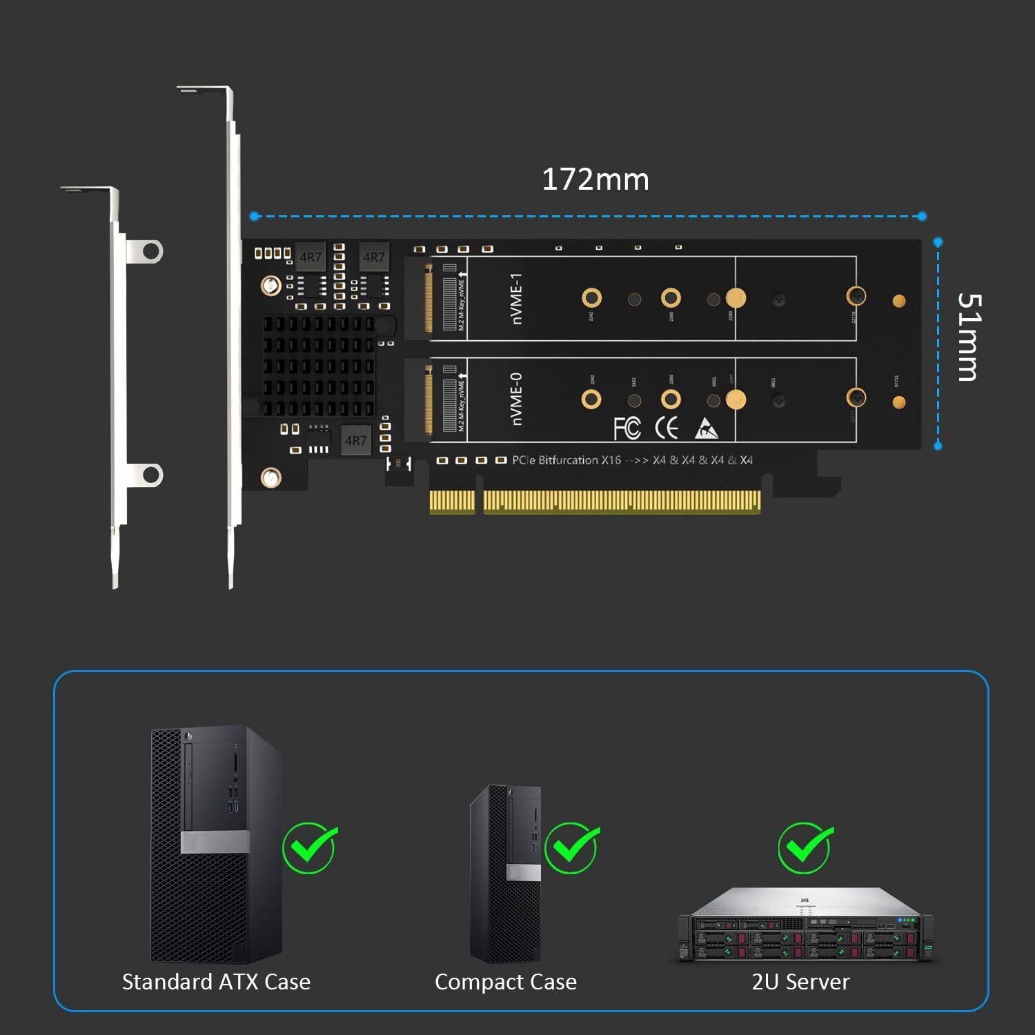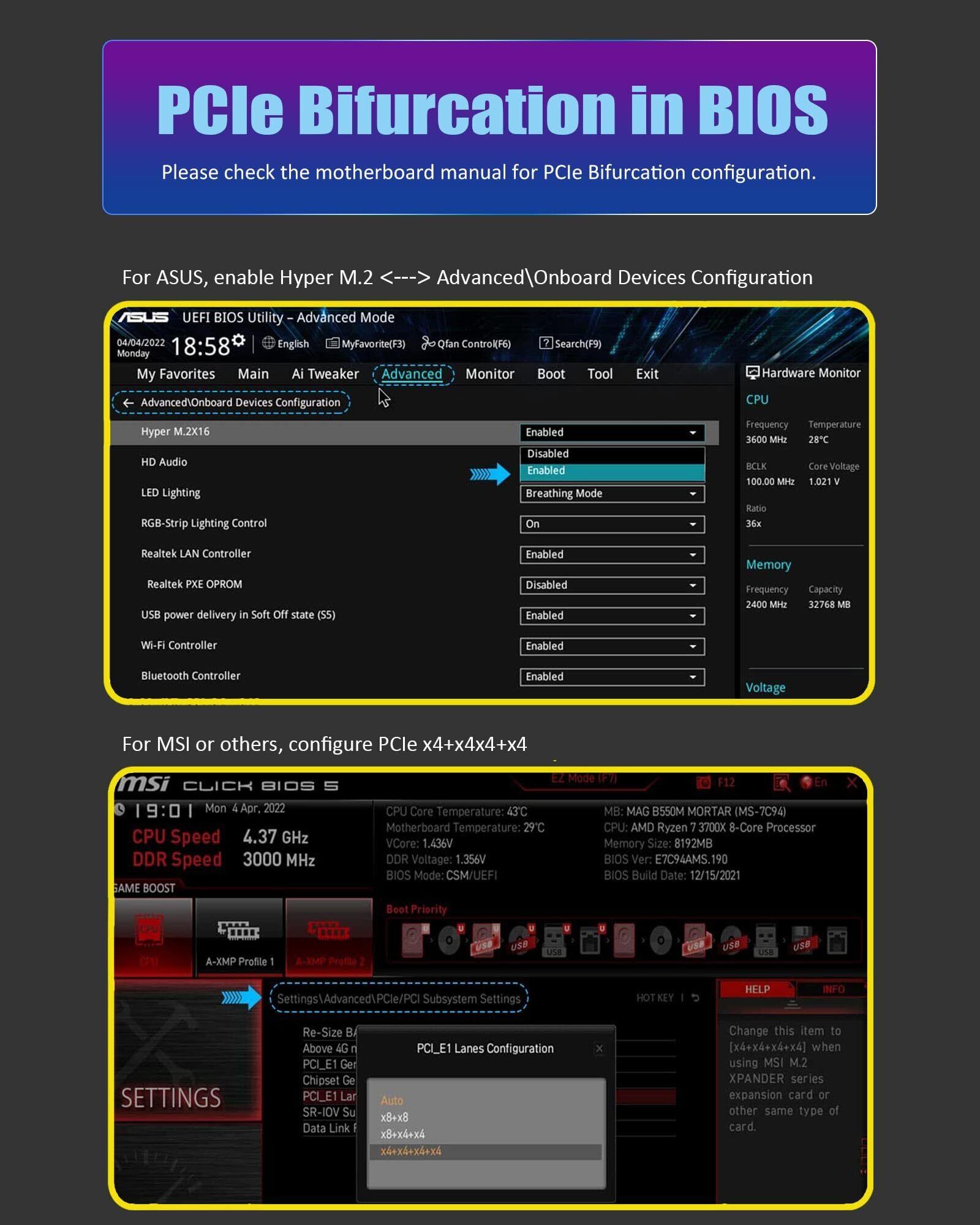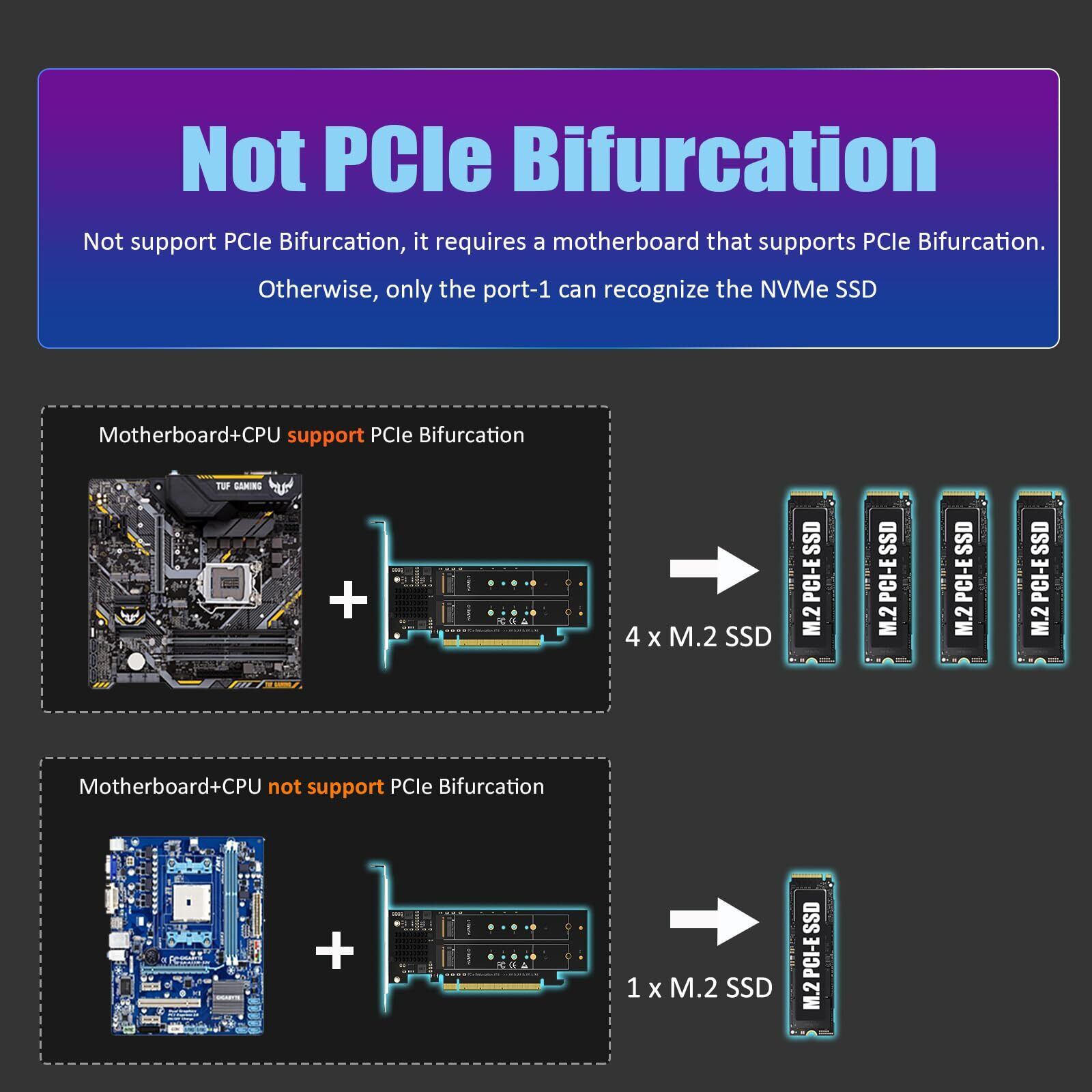重要: このアダプタは PCIe 分岐をサポートしていないため、PCIe Bifurcation をサポートするマザーボードが必要です。そうでない場合は、NVMe-1 ポートのみが NVMe SSD を認識できます。ご購入前に、マザーボードメーカーのウェブサイトからマザーボードマニュアルのPCIe拡張スロット部分を確認するか、に直接ご相談ください。