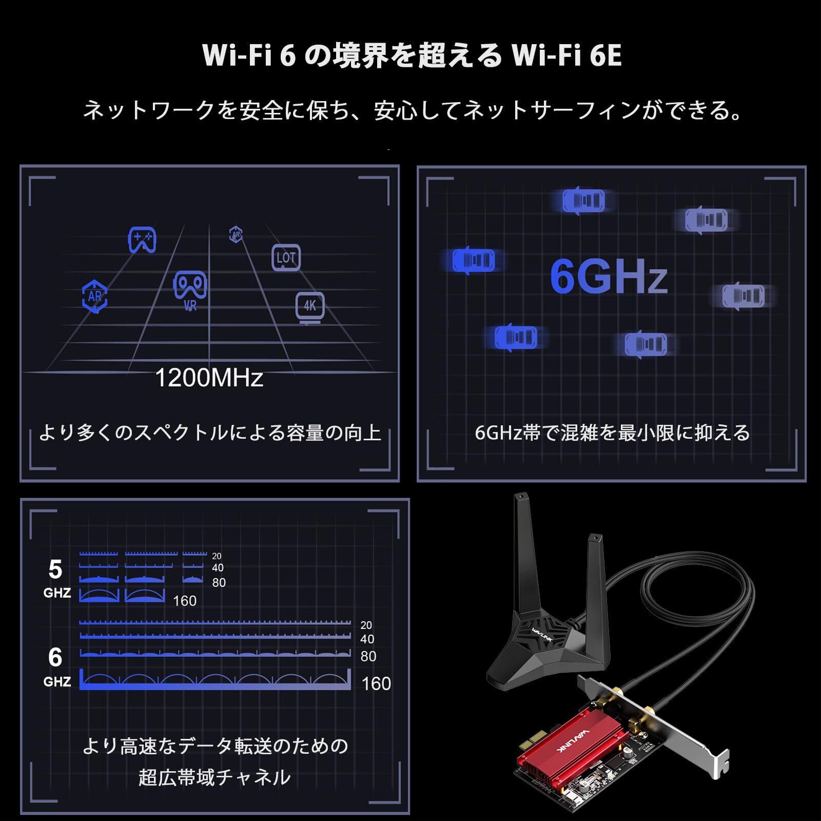 【次世代 WiFi 6E へのアップグレード】: より大容量でパフォーマンスが向上したWiFi 6E ネットワーク カードは、OFDMA、MU-MIMO、1024QAM、ターゲット ウェイク タイム (TWT) などの最新の 802.11ax テクノロジーを対応しています。高密度または混雑した環境でも高速データ転送を実現し、超低遅延の極速ゲーム体験を提供します。
