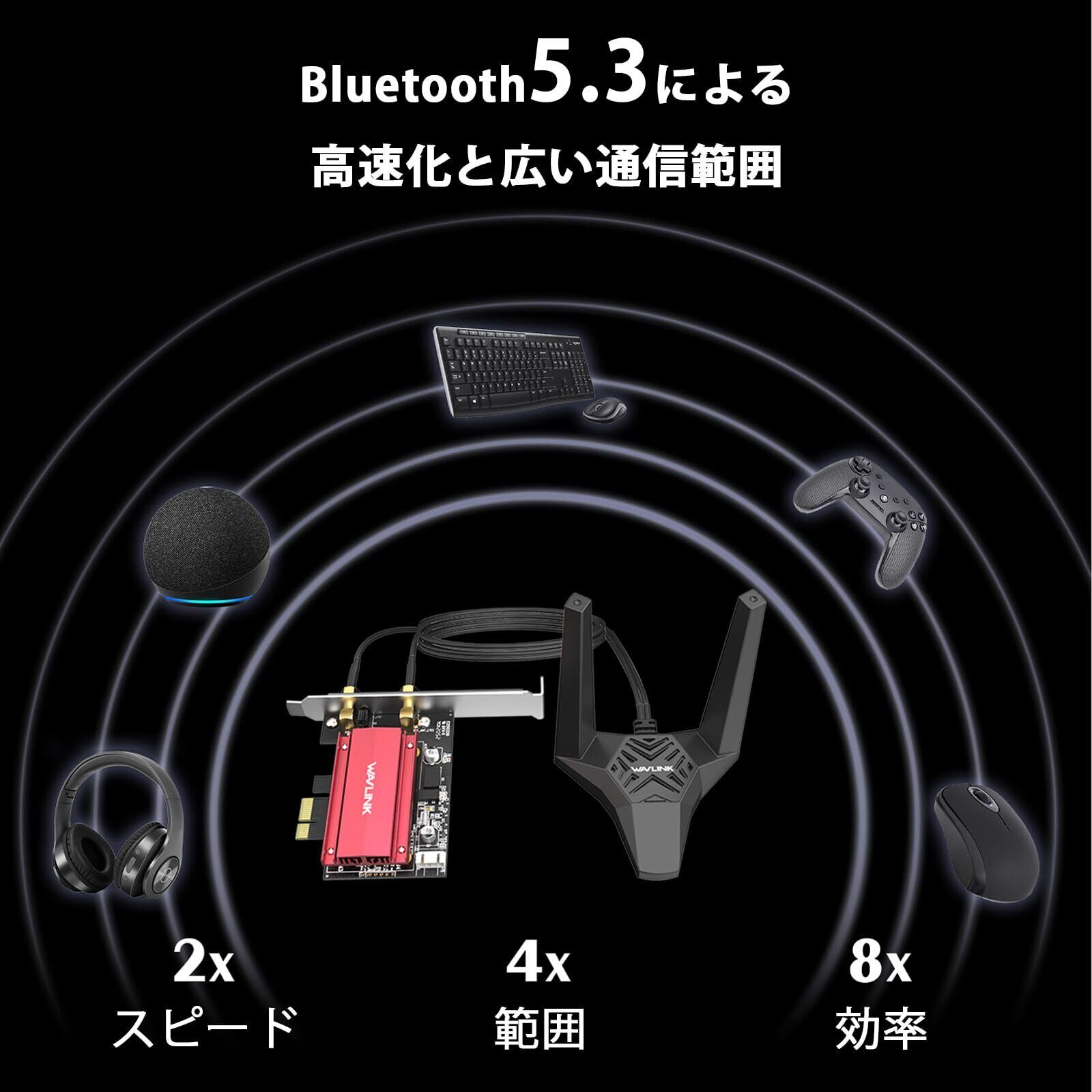 【Bluetooth 5.3 および WPA3 セキュリティ】: 最新の BT5.3 は、コンピューターと Bluetooth 対応デバイスの間に強力なワイヤレス データ接続を提供し、2 倍の伝送速度と 4 倍の通信範囲を実現します。さらに、高度な WPA3 セキュリティ プロトコルによりハッカーやマルウェアからネットワークが大幅に保護され、安心して高速 WiFi を楽しむことができます。