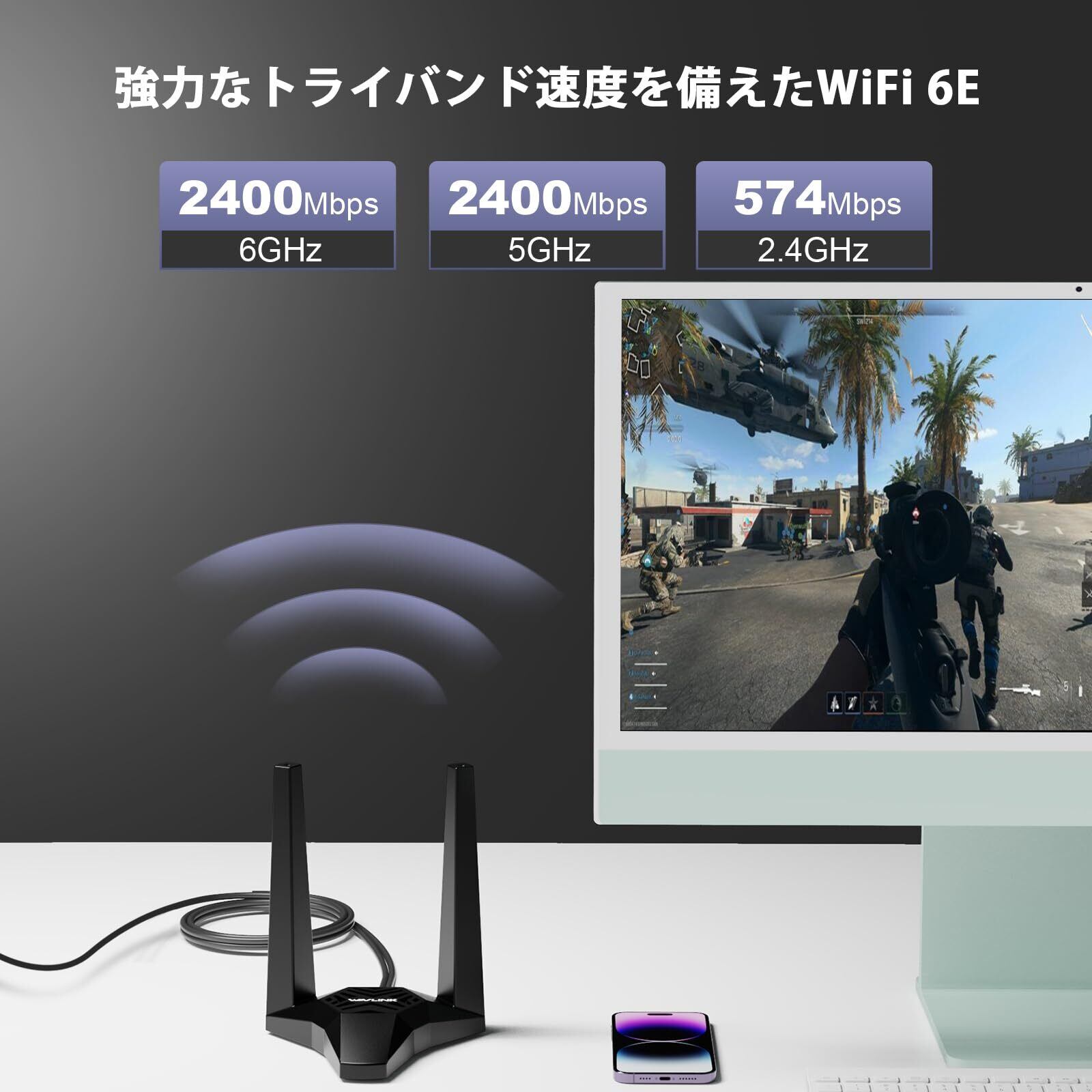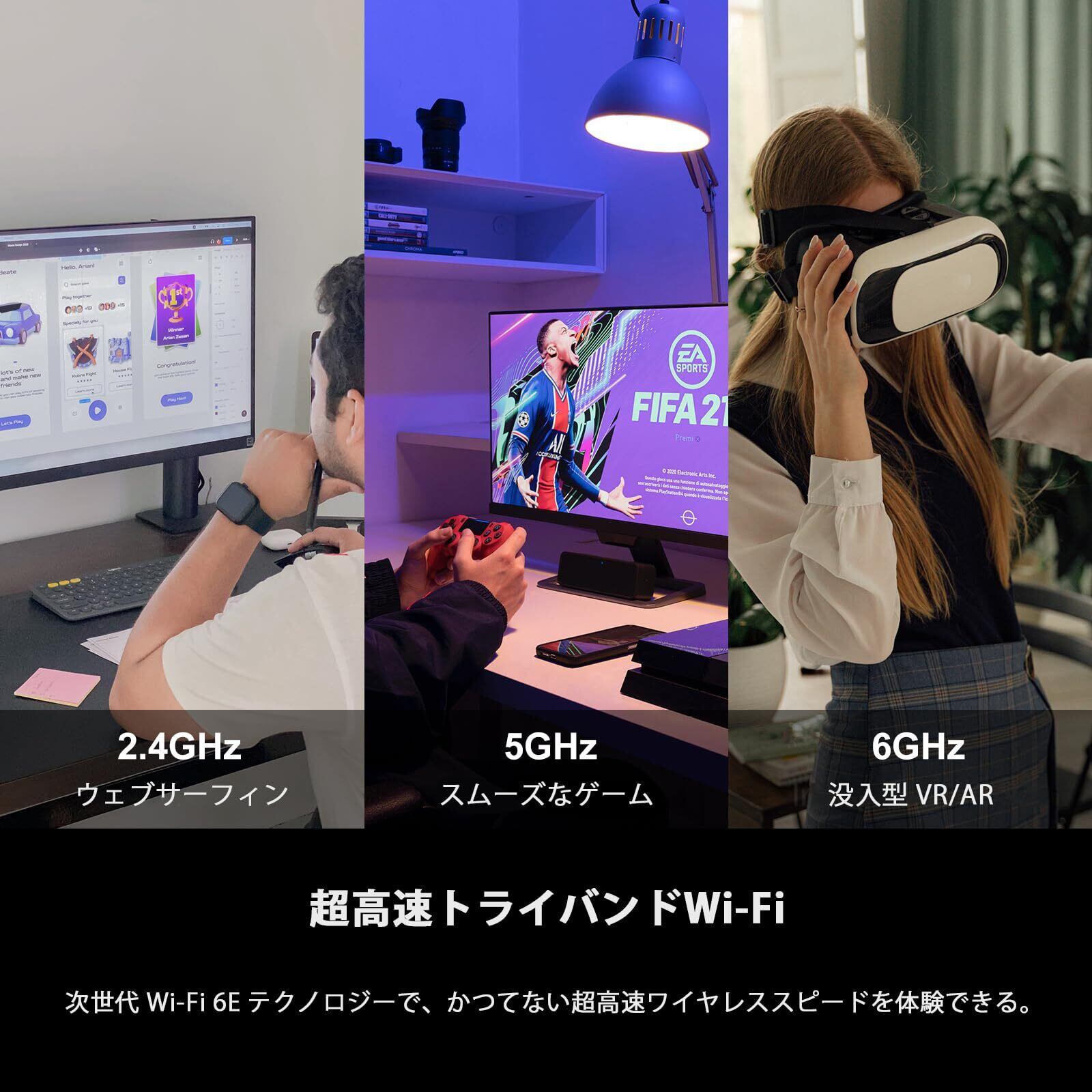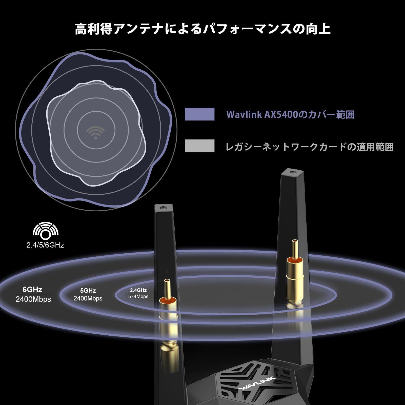 「本製品は、2.4GHz、5GHz、そして6GHzのトライバンドに対応し、それぞれの帯域で最大5400Mbpsの速度を提供します。特に、6GHz帯の利用により、混雑した環境でも低遅延で快適な通信が可能です!」