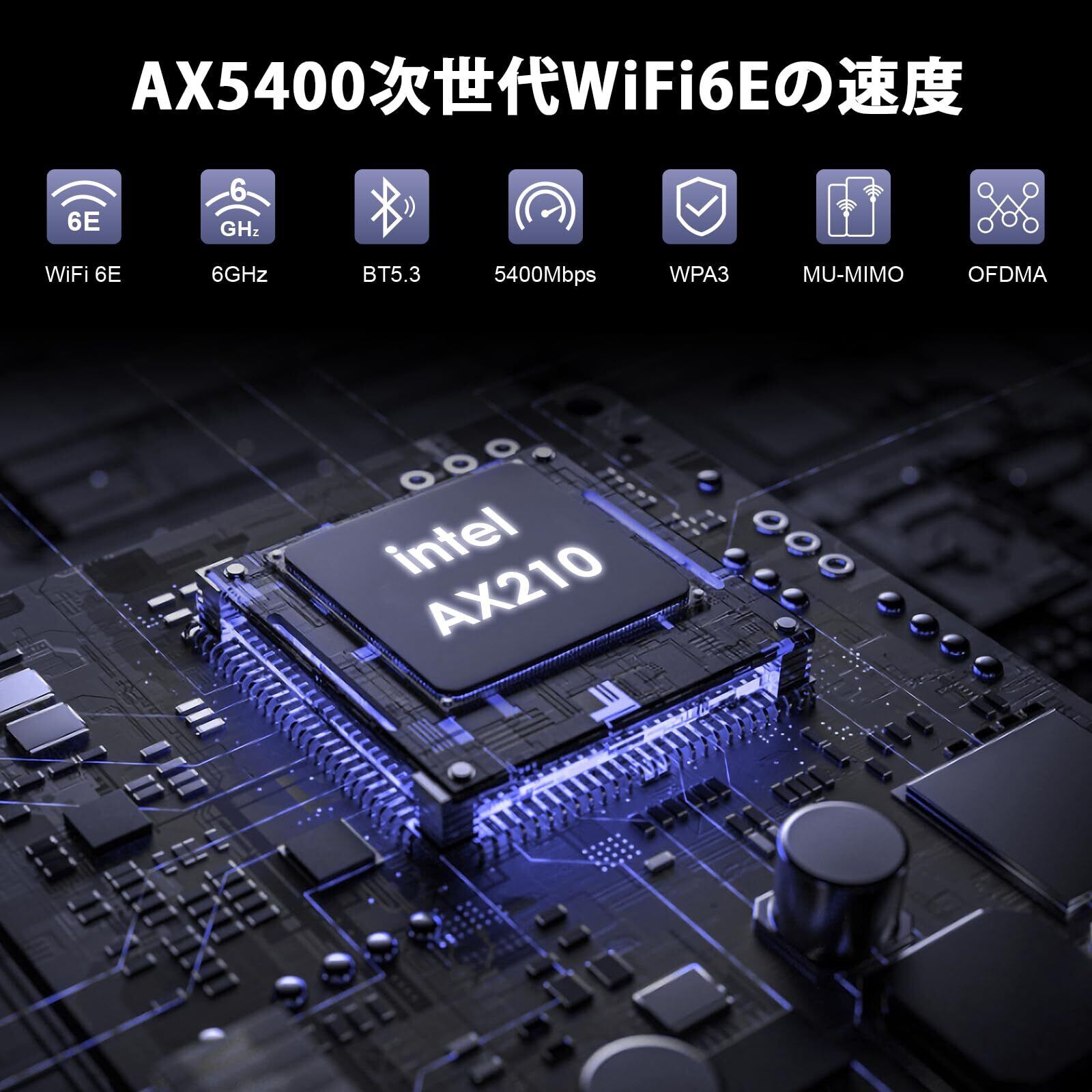 【遅延なし接続】:Intel AX210チップセットはWiFiを6 GHz帯に拡張し、WiFiを3周波数に更新して、最高速度は2.4 GHzの574 Mbps、5 Ghzの2400 Mbps、6 GHzの2400 Mb/sに達することができます。2.4 GHzは長距離伝送に、5 GHzはゲームや4 Kストリーミングに、6 GHzは超スムーズでリアルタイムのゲームや没入型VR体験に理想的な選択肢です。