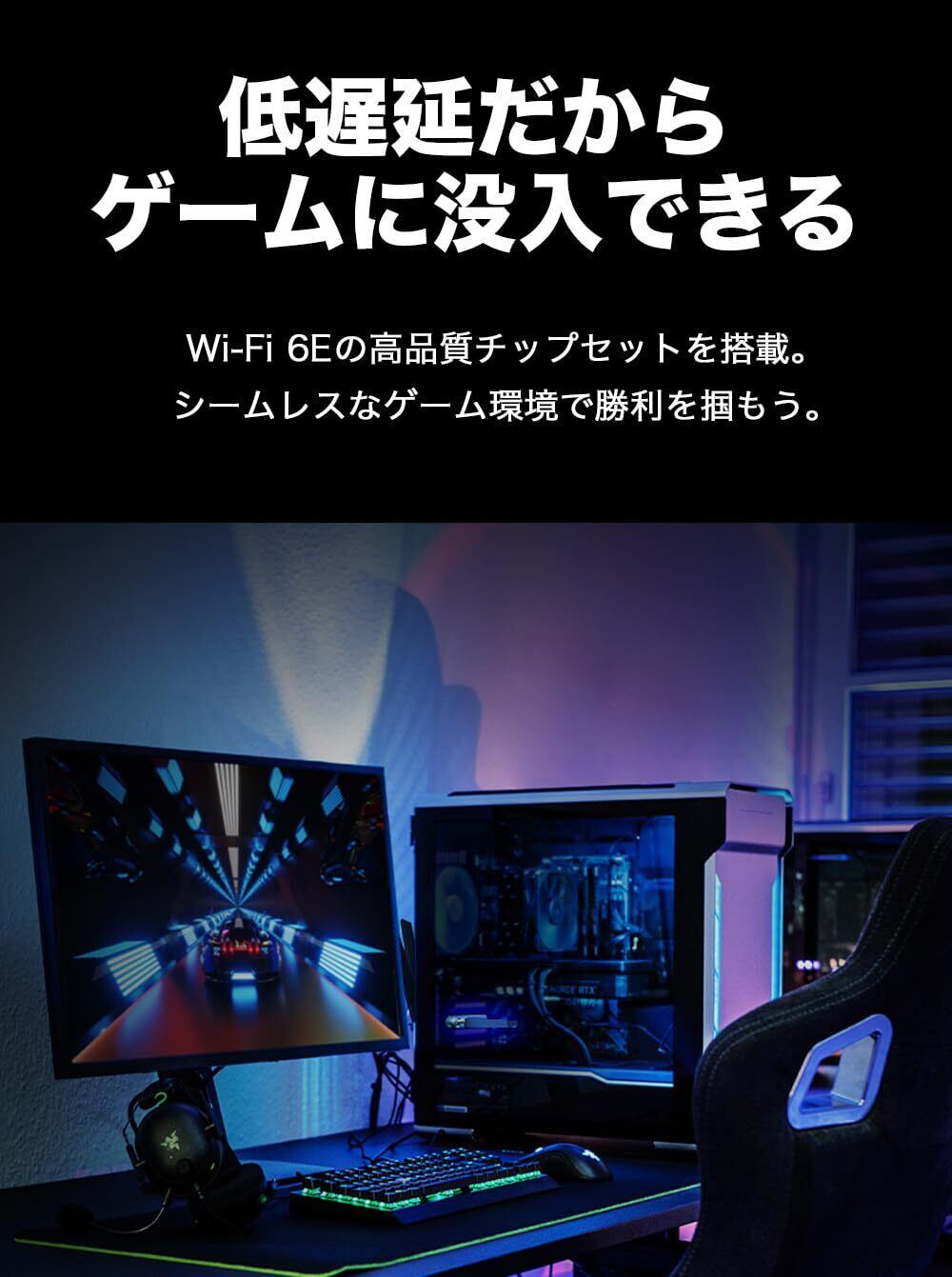 [特徴] Wi-Fi 6E対応トライバンド PCI-Eアダプター。 2402Mbps (6GHz) + 2402Mbps(5GHz) + 574Mbps (2.4GHz)。インストール型。