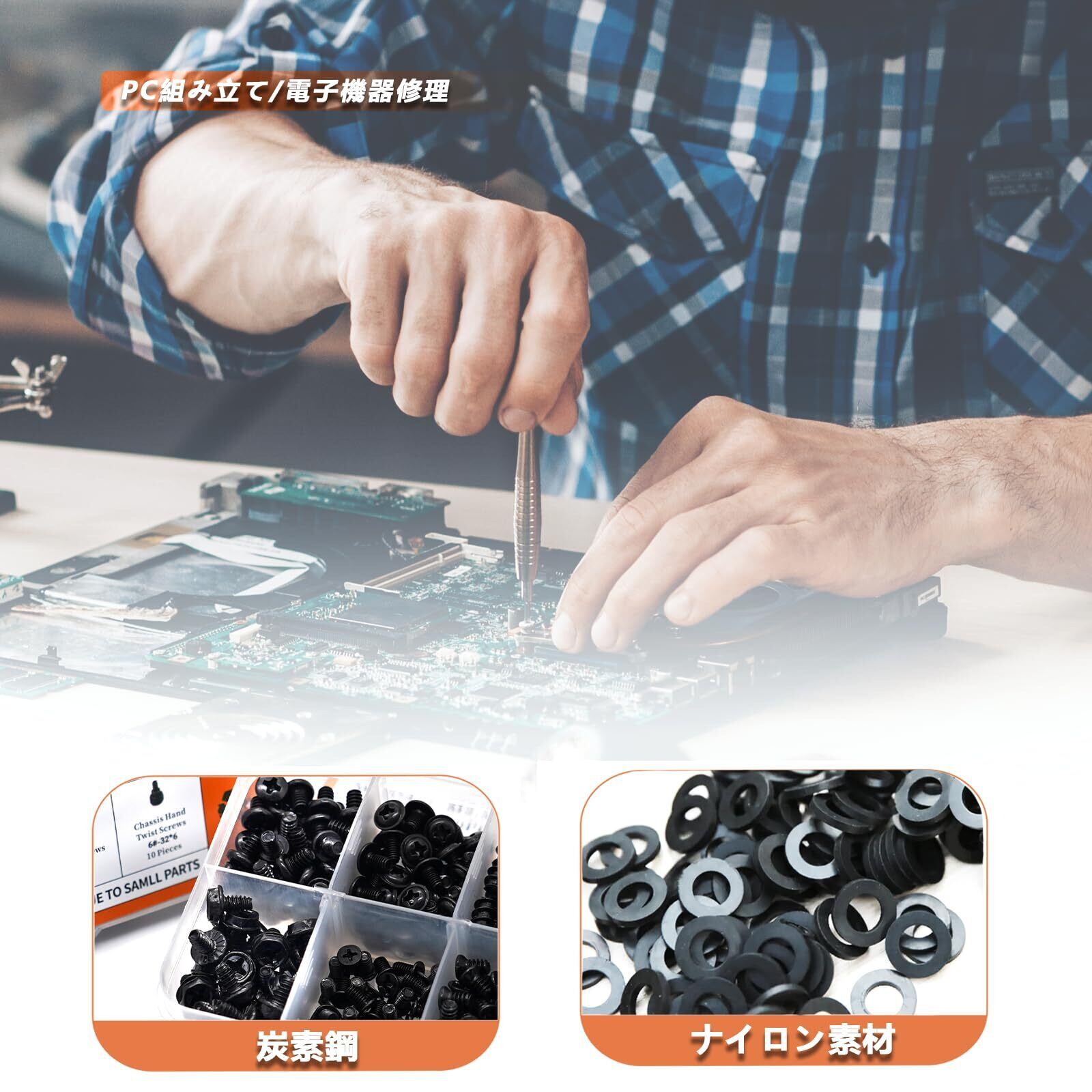 便利な収納ケースとピンセット付属:ネジはサイズ別に仕切られた収納ケースに整理され、付属のピンセットで細かい作業も快適。黒色の各種ネジは磁石に吸着する仕様で、マグネットドライバーとの相性も抜群、作業効率がさらに向上します。