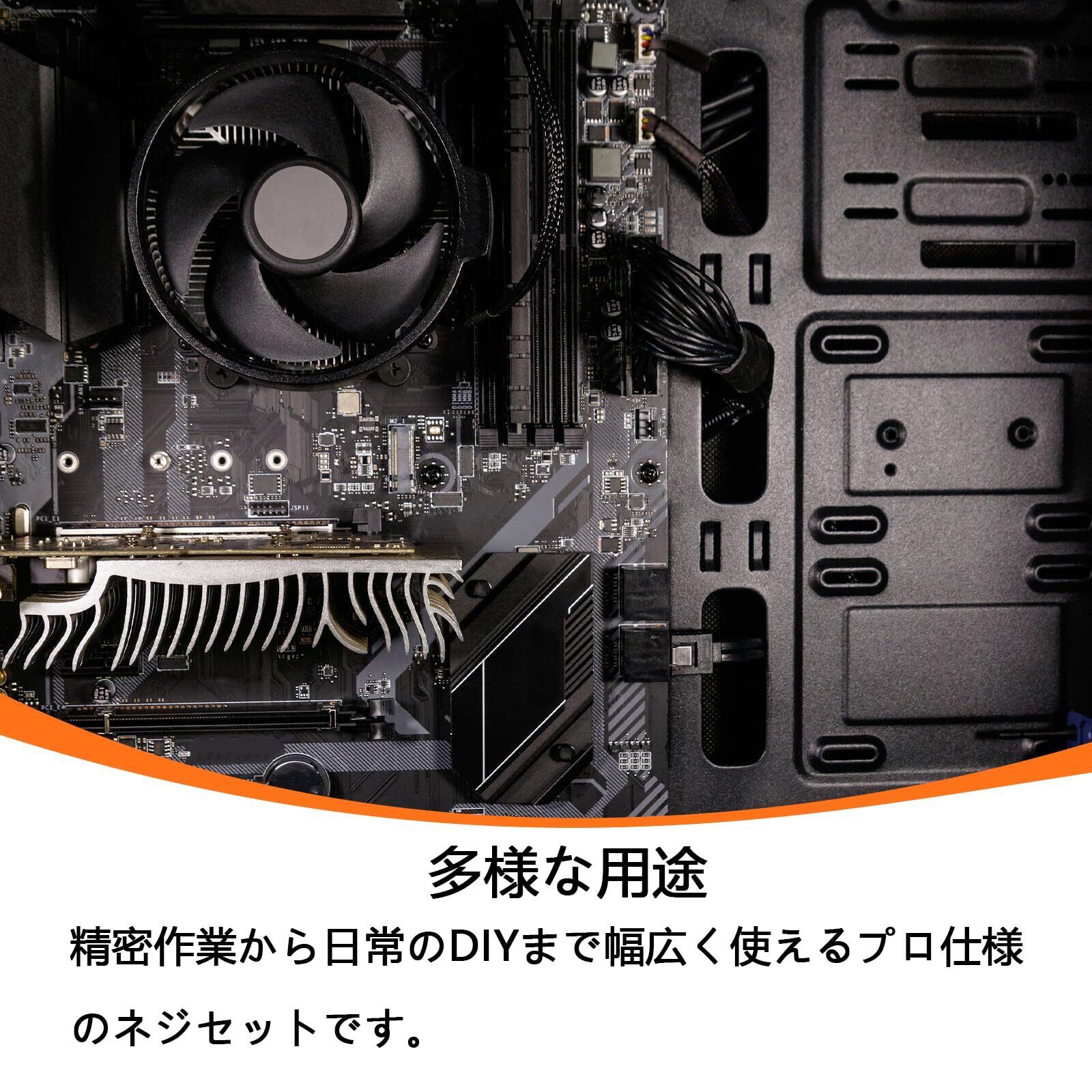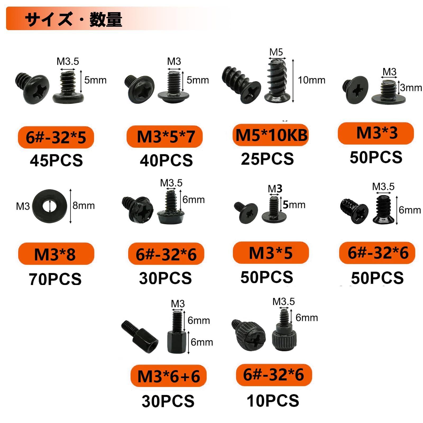 「M2、M3、M3.5のサイズのネジがそれぞれ含まれており、用途に応じて最適なネジを選ぶことができます。HDDやSSDの固定、またはメモリの取付けなどに対応可能ですので、ご家庭でのDIYにも最適です!」