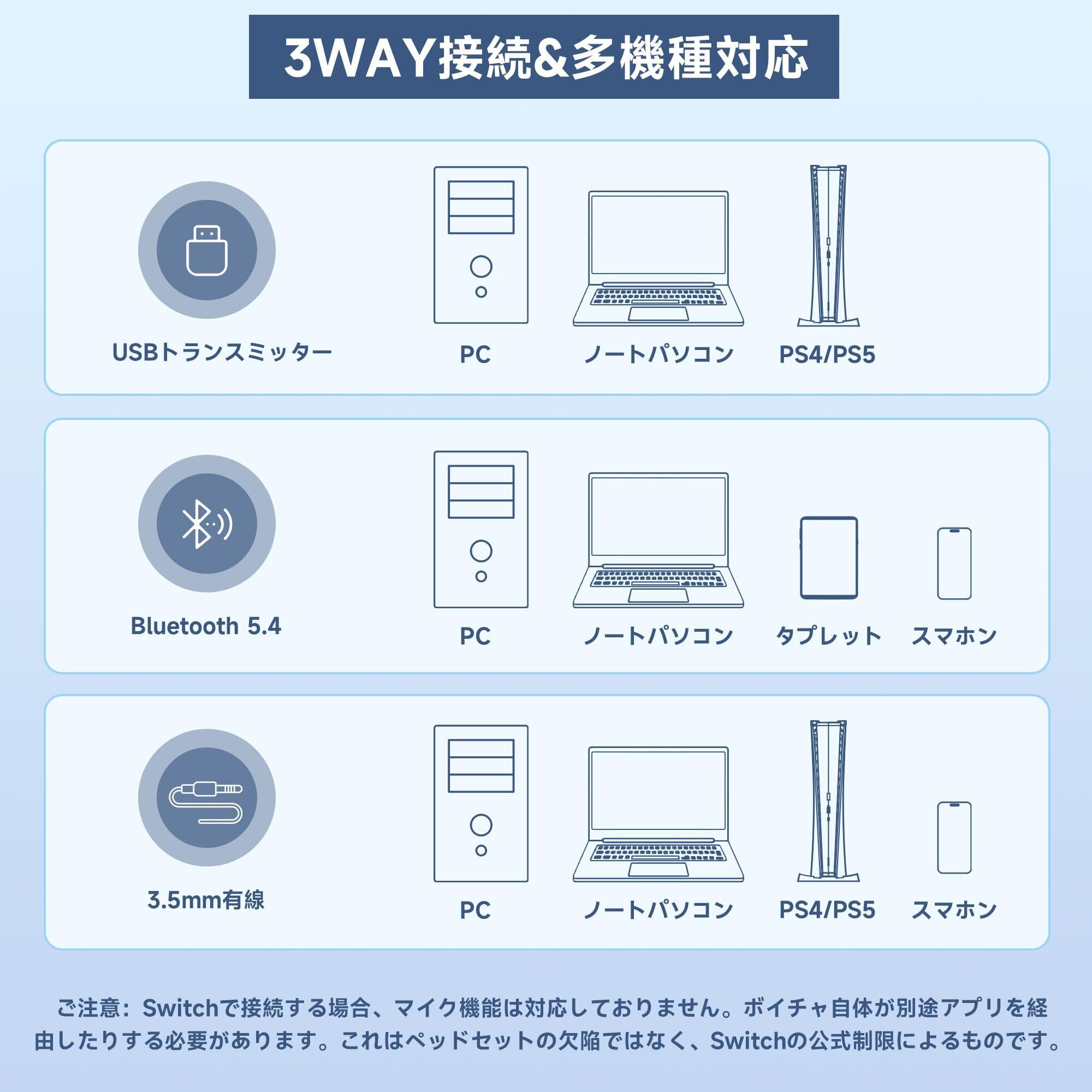 「Bluetooth 5.4、USB、そして有線接続の3WAY対応により、パソコンやスマートフォンなど様々なデバイスと接続可能です。用途に応じて最適な接続方式を選択できるため、非常に便利です。」